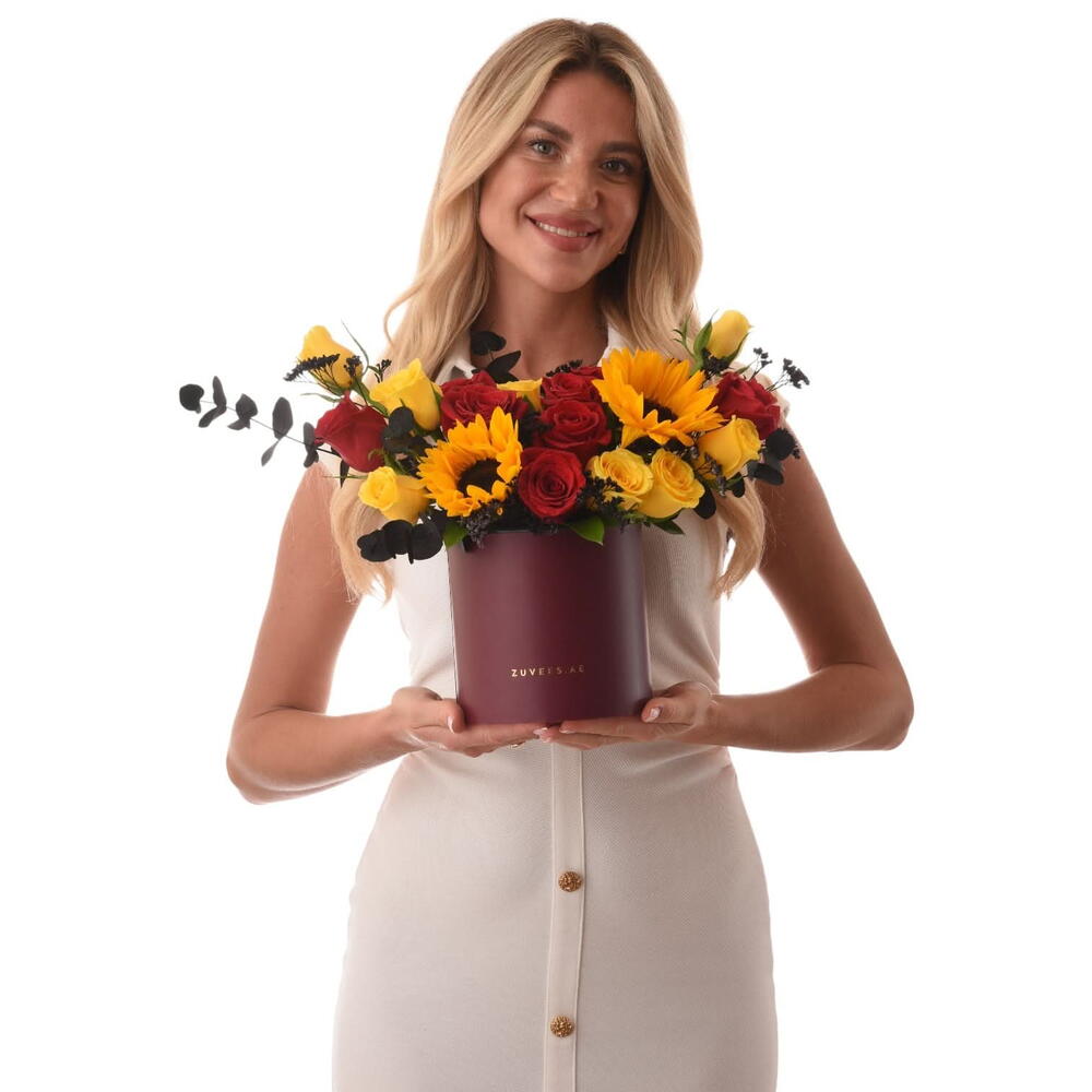 Эта потрясающая композиция состоит из двух золотисто-жёлтых подсолнухов, символизирующих радость и жизненную силу, восьми красных роз, символизирующих любовь и восхищение, и восьми жёлтых роз, символизирующих счастье и дружбу. Композиция, дополненная четырьмя чёрными ветками эвкалипта и тремя чёрными веточками лимониума, сочетает в себе яркость и контраст с современной изысканностью. Роскошную цветочную композицию дополняют карамельки Mirzam – Spice Route, изготовленные вручную в Дубае с бархатистой карамелью и ароматными специями – изысканное лакомство, которое придаёт сладость каждому жесту.