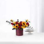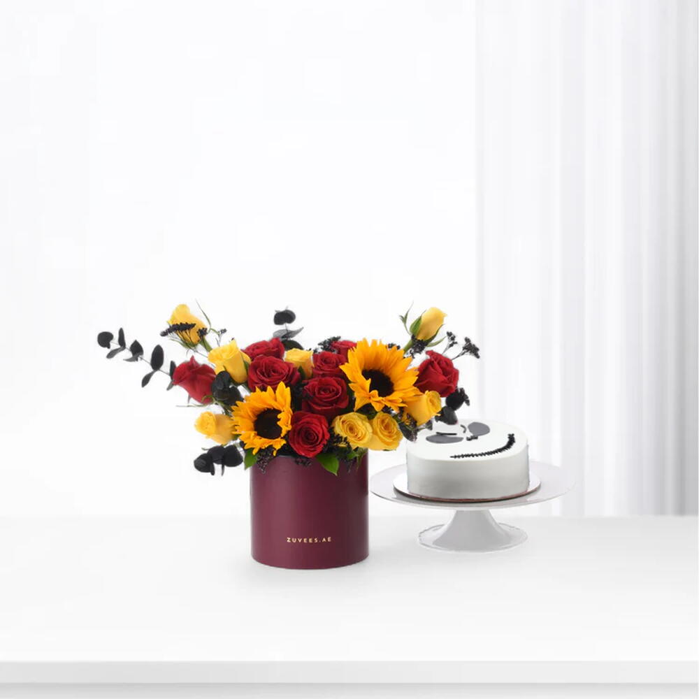 Эта восхитительная композиция «Цветы в коробке» сочетает самые яркие краски природы с изысканным угощением. В ней — 2 сияющих подсолнуха, симфония из 8 красных и 8 жёлтых роз; глубину добавляют элегантные штрихи: 4 веточки чёрного эвкалипта и 3 стебля чёрного лимониума. Завершает эту роскошную аранжировку шоколадный торт весом полкилограмма в хэллоуинской тематике — захватывающий сюрприз, делающий этот набор идеальным для сезона или для любого праздника, где нужен оттенок озорства и море красоты.