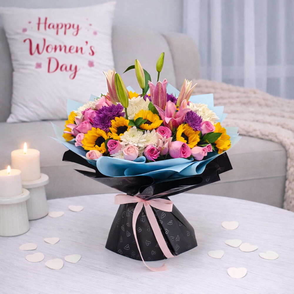 Дес - Прекрасный букет из 8 подсолнухов, 5 белых хризантем, 3 фиолетовых хризантем, 3 розовых лилий на 3 стеблях, 25 розовых роз разных сортов, завернутый в однотонную синюю и черную обертку в форме сердца, перевязанную розовой лентой.