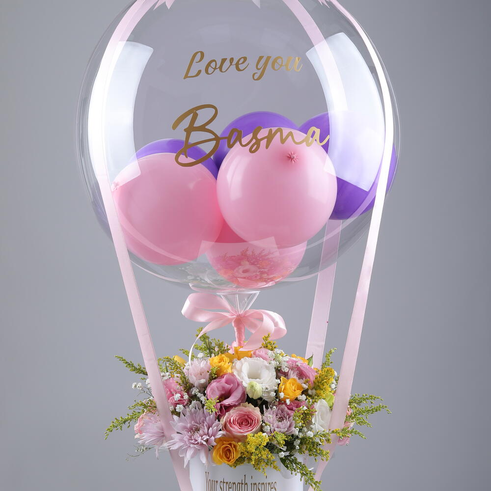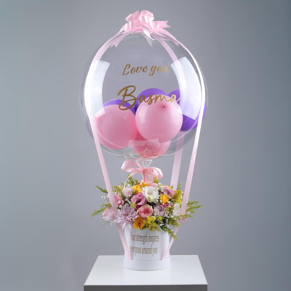 Удивите своих близких душевным посланием и подарите им взрыв цветочной радости. Воздушный шар «Floating Wishes» – это восхитительное сочетание элегантных цветов и игривого очарования, созданное для того, чтобы отпраздновать любовь, силу и особые моменты самым уникальным образом. Эта очаровательная композиция, упакованная в элегантную круглую белую коробку, представляет собой яркое сочетание розовых хризантем, кустовых роз, нежных лизиантусов, роз нежной выразительности, золотистого солидаго и воздушной гипсофилы. Цветочное основание венчает кристально чистый воздушный шар, украшенный внутри мини-шариками пастельных тонов и перевязанный изящной розовой атласной лентой. 💬 Индивидуальный подход: добавьте на воздушный шар ваше индивидуальное послание – от имени до трогательных слов – чтобы сделать подарок поистине уникальным. Мы осуществляем доставку по Дубаю, Шардже и Аджману, доставляя красоту наших цветочных композиций прямо к вашему порогу.