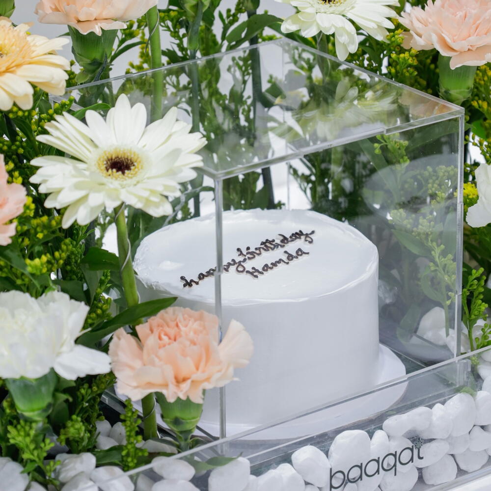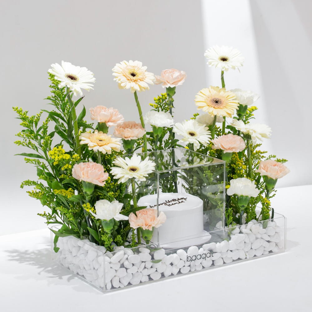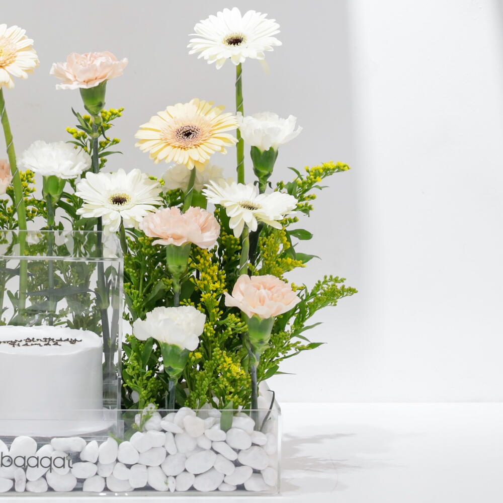 carnation white - 4 шт. гермини белая - 4 шт. персиковая гвоздика - 7 шт. премиальный кремовый торт - 1 шт. гермини бежевый - 3 шт.