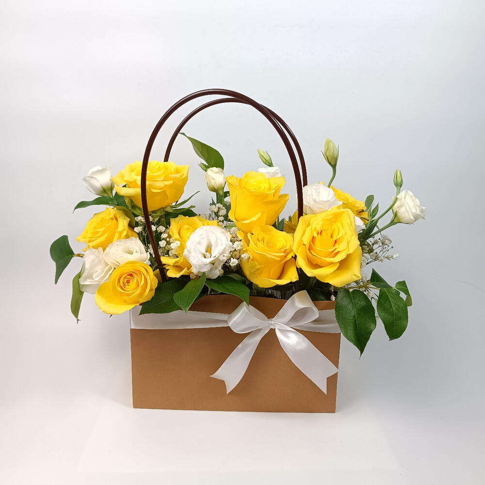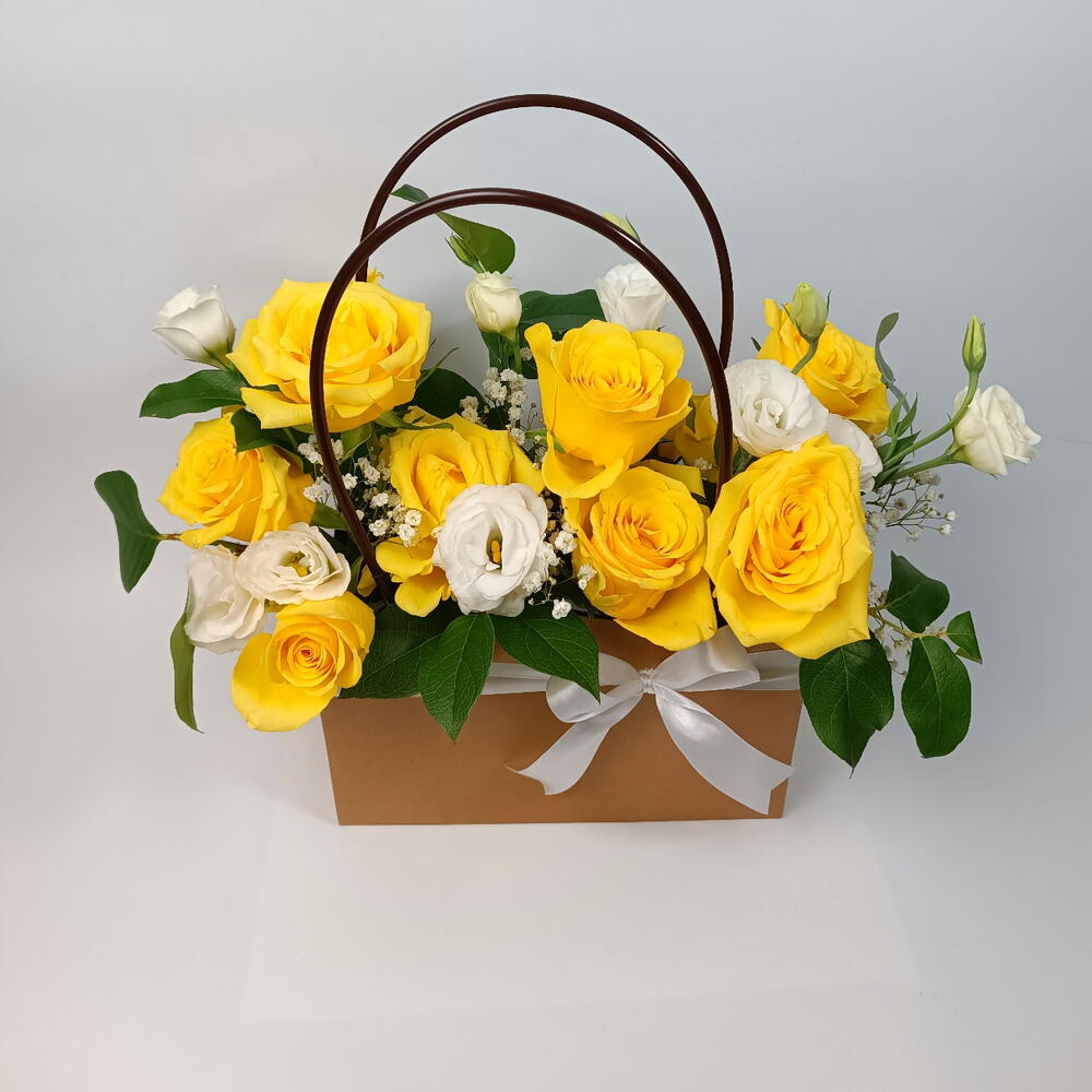 Яркий, радостный и непринуждённо элегантный — Sunny Charm — это красивое компактное цветочное оформление в сумочке, созданное, чтобы впечатлять. Премиальные жёлтые розы дарят тёплое солнечное сияние, в сочетании с нежными белыми лизиантусами (eustoma) и воздушной гипсофилой (gypsophila) для чистого, изысканного завершения. Оформленное в стильную коробку‑сумочку и перевязанное атласным бантом, оно идеально подходит в качестве подарка на день рождения, для юбилейного сюрприза, букета в знак благодарности, пожелания скорейшего выздоровления или милого поздравительного букета — его легко носить, оно эффектно смотрится.