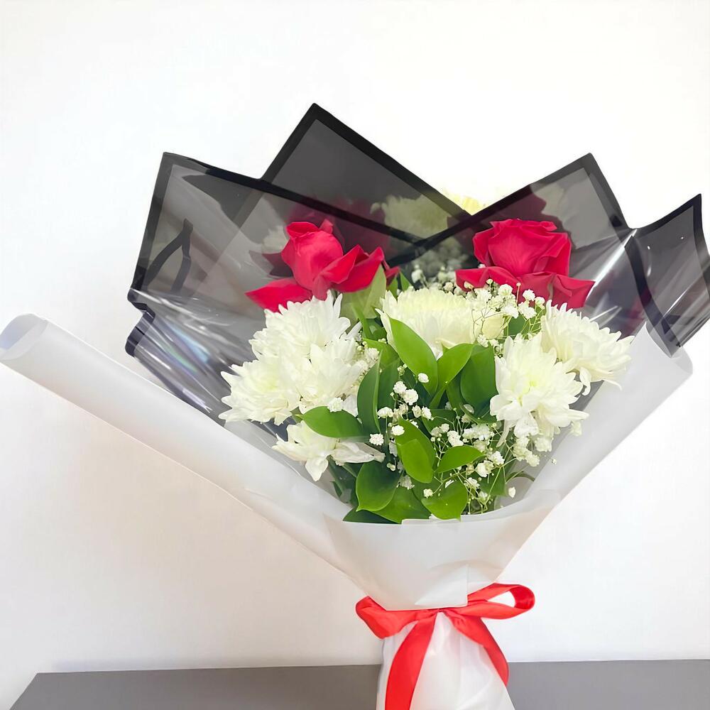 Red rose - 2 шт. гипсофила - 2 шт. хризантема белая - 3 шт. одинокий - 10 шт.