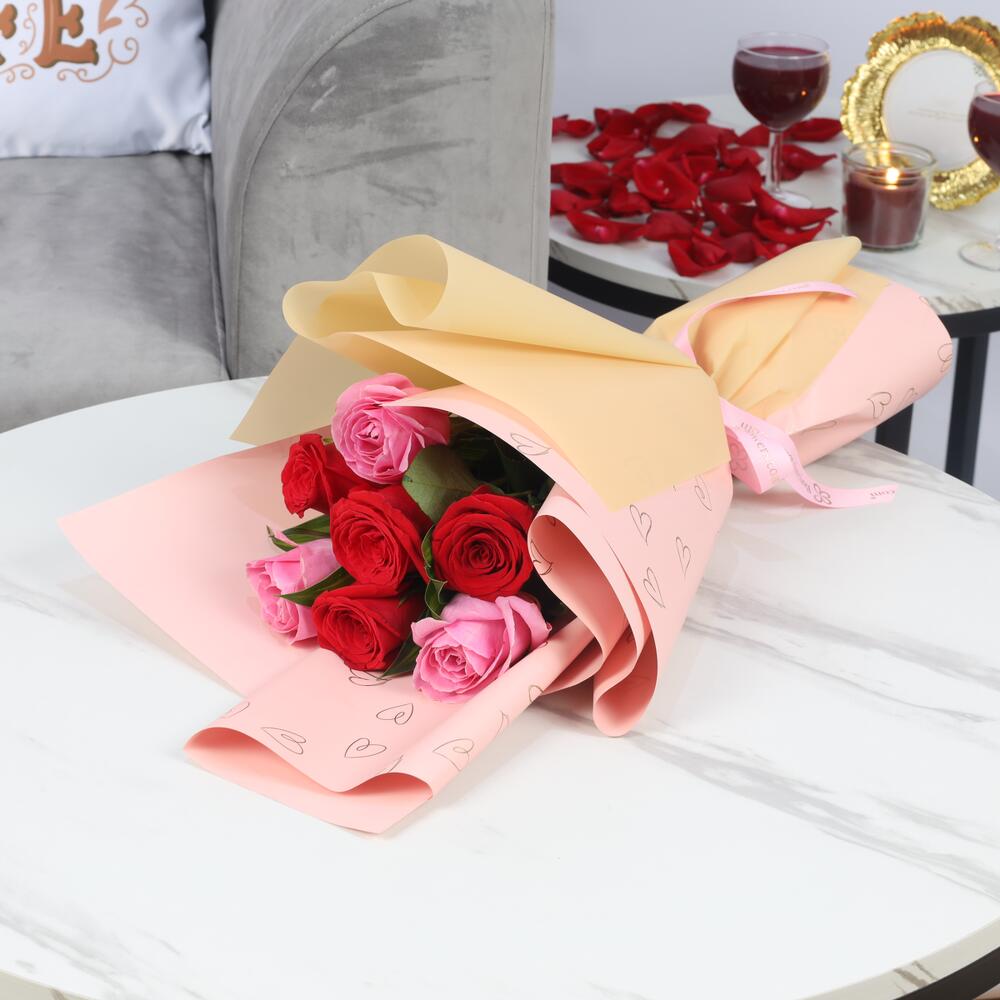 Песня Индии - 2 шт. red roses - 4 шт. pink roses - 3 шт. упаковано в розовую с сердечками и бежевую упаковку - 1 шт. перевязан бантом из розовой ленты - 1 шт.