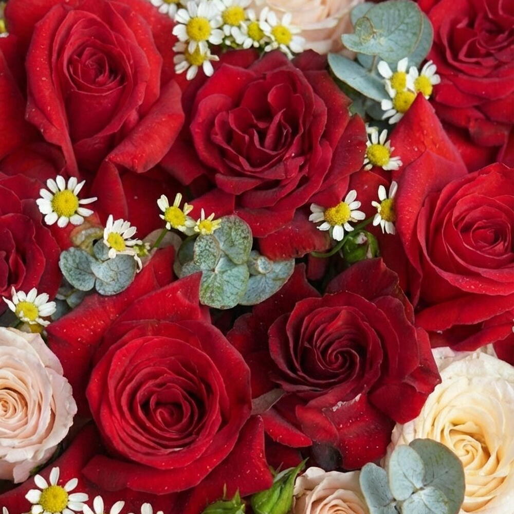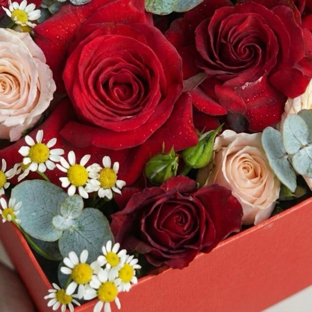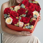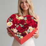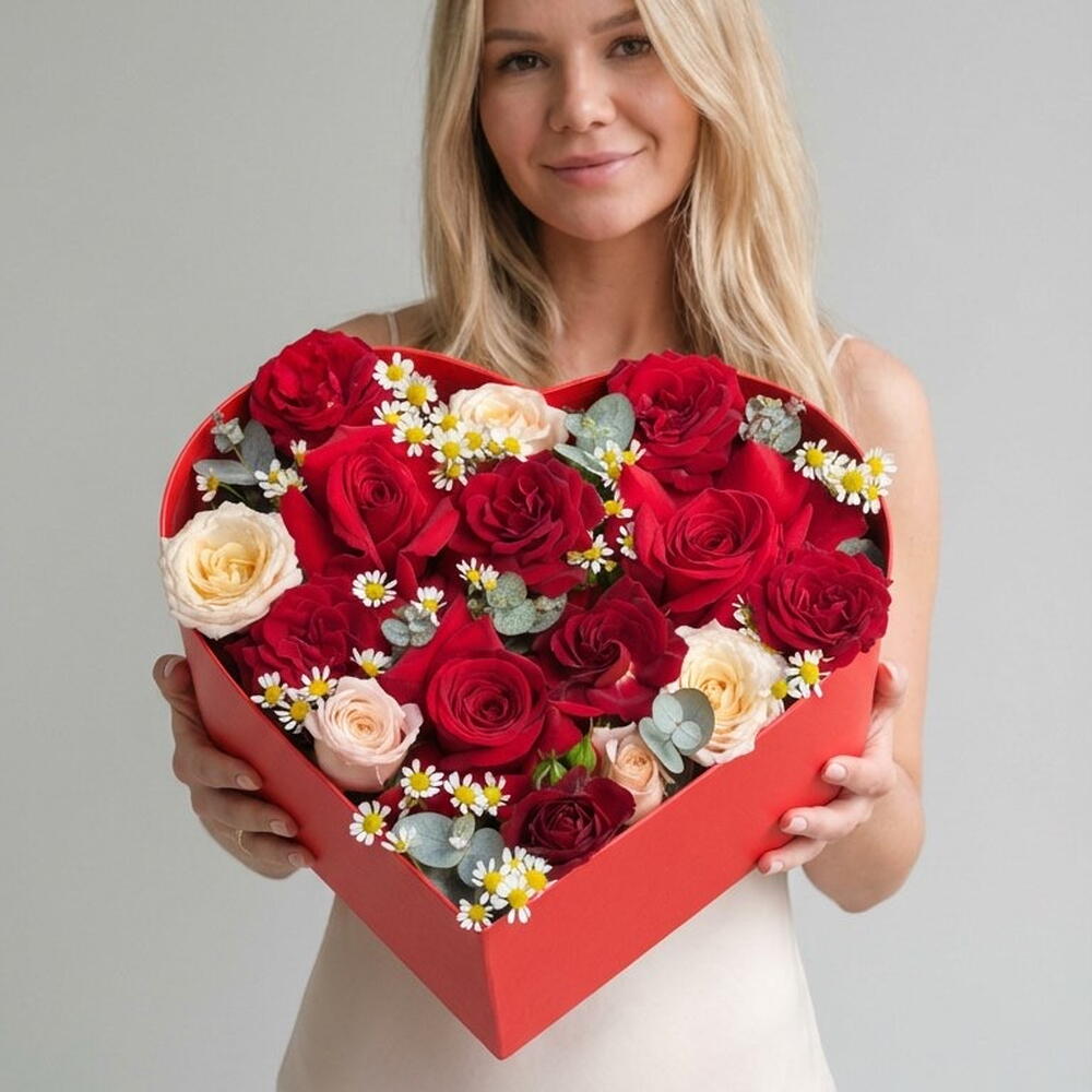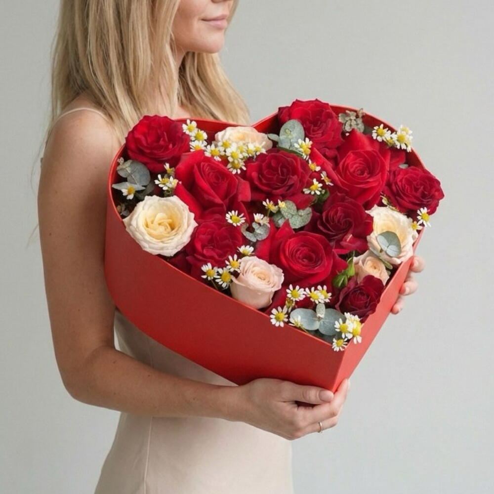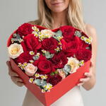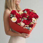 Red heart box with red roses amazing original gift. Red roses and red spray roses matching with eucalyptus and looks very elegant