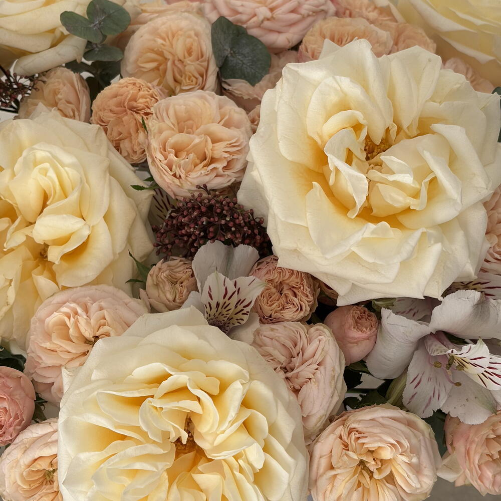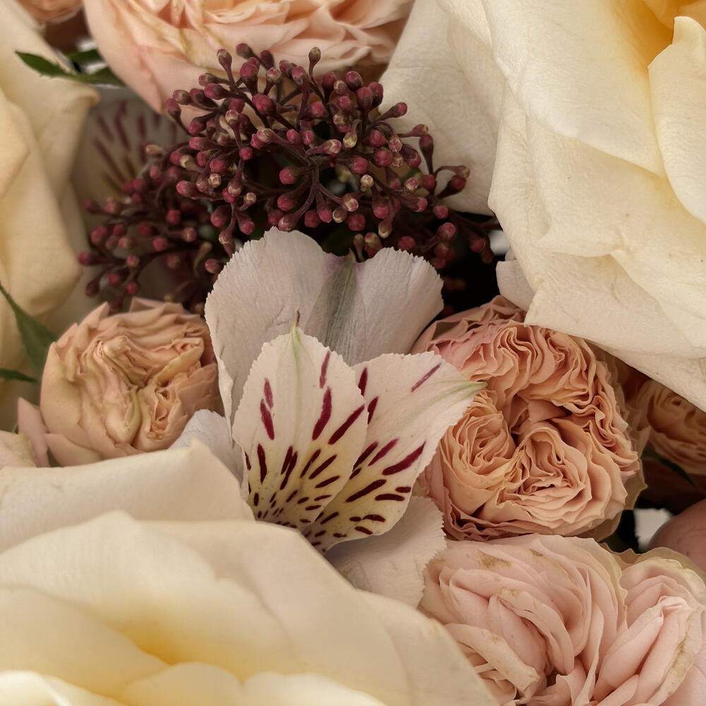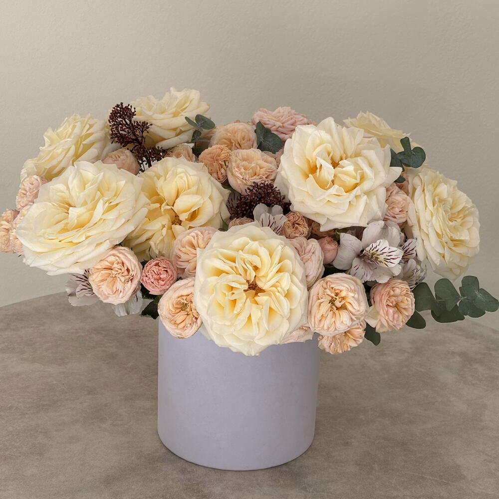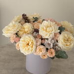 A luxury flower box with cream and peach roses — refined, soft, and elegantly timeless. This premium floral arrangement features large garden-style roses in warm cream tones, delicate peach spray roses, seasonal flowers, and fresh greenery, carefully arranged in a stylish round box. The composition feels light, airy, and sophisticated — perfect for those who appreciate understated luxury and natural beauty. This flower box is ideal for: — birthdays — anniversaries — elegant congratulations — romantic gifts — stylish interior decor Each arrangement is handcrafted by professional florists using only fresh, high-quality flowers to ensure long-lasting beauty and a flawless presentation.