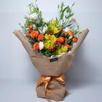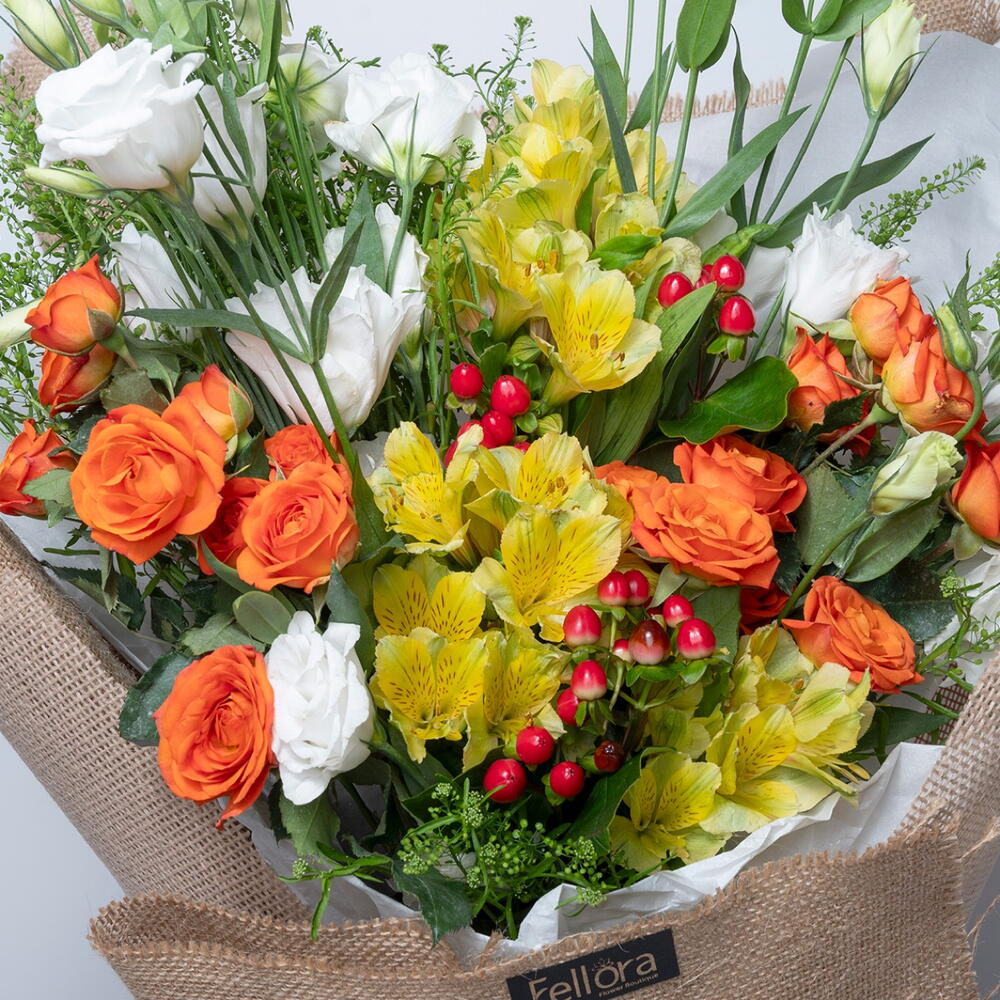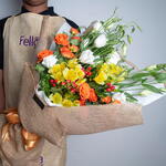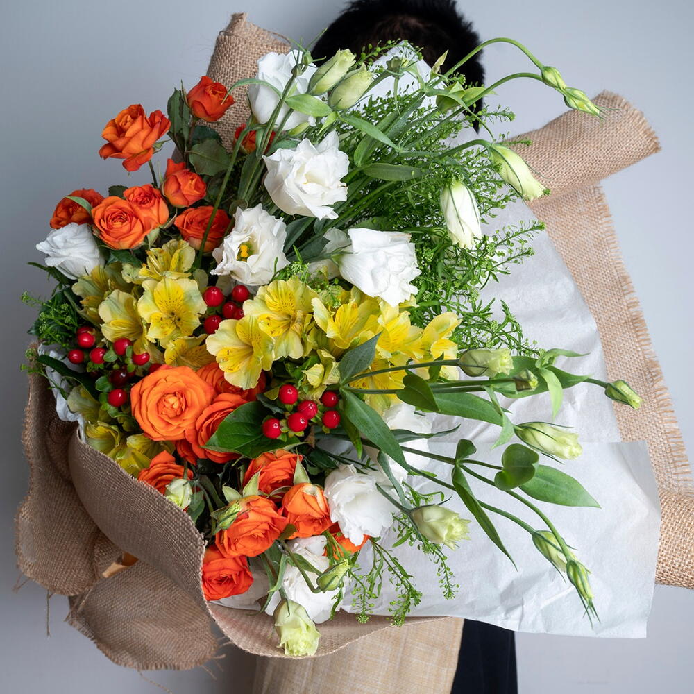 Ribbon - 1 шт. Lisianthus - 4 шт. alstroemerias - 5 шт. оранжевая мини-роза - 4 шт. гиперикум красный - 4 шт. липидиум - 3 шт. джутовая флористическая упаковка - 3 шт.