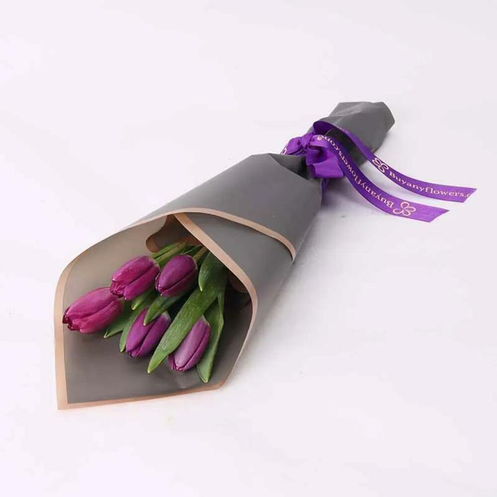 фиолетовые тюльпаны - 5 шт. конфеты Patchi делюкс - 3 унц.