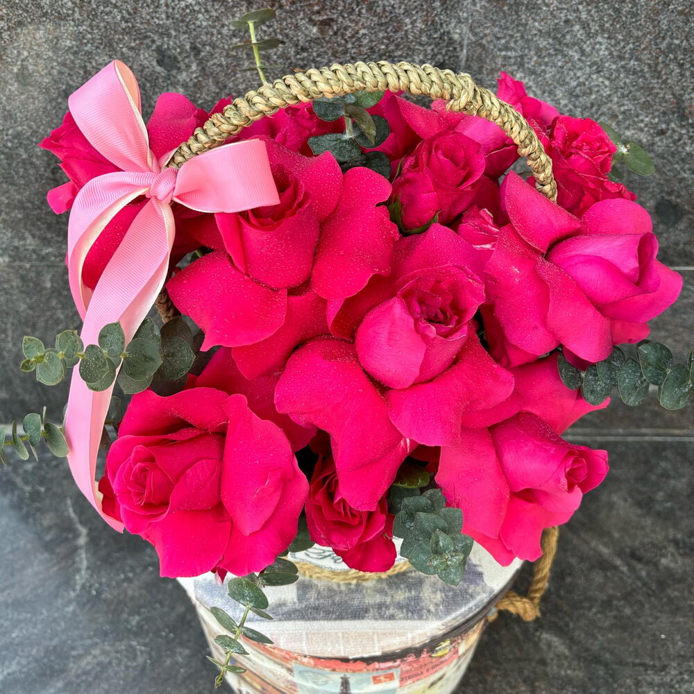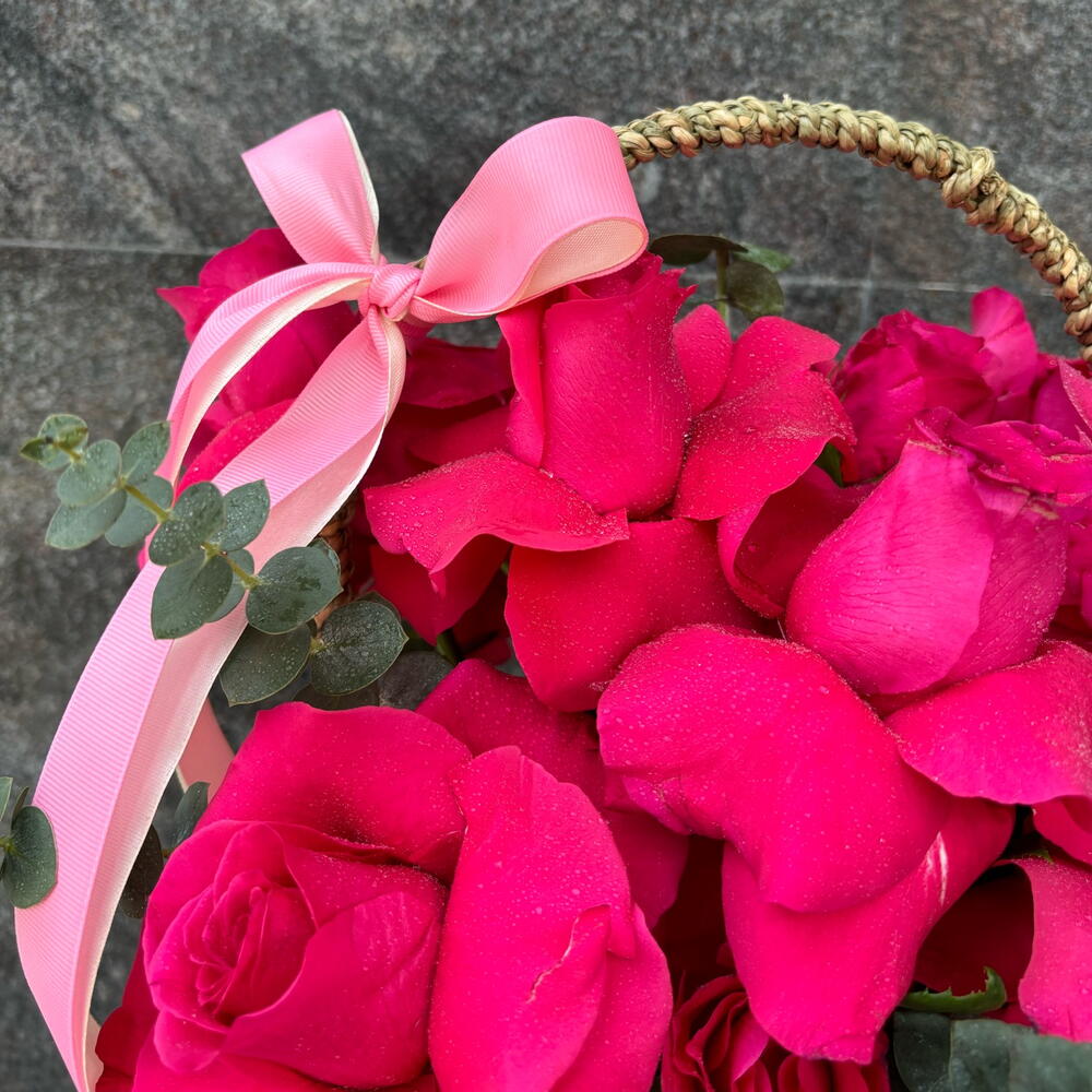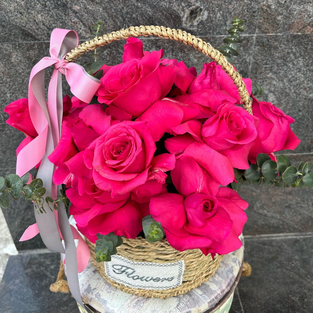 Эта очаровательная композиция «Цветы в корзине» — воплощение истинной элегантности. Тщательно отобранные ветки эвкалипта изящно сочетаются с великолепной композицией из 19 нежно-розовых роз. Всё искусно собрано в аутентичной корзине и деликатно дополнено блестящей шелковой лентой. Это захватывающее цветочное произведение, идеально подходящее для любых случаев, гарантированно станет выделяющейся композицией, источающей очарование и красоту.