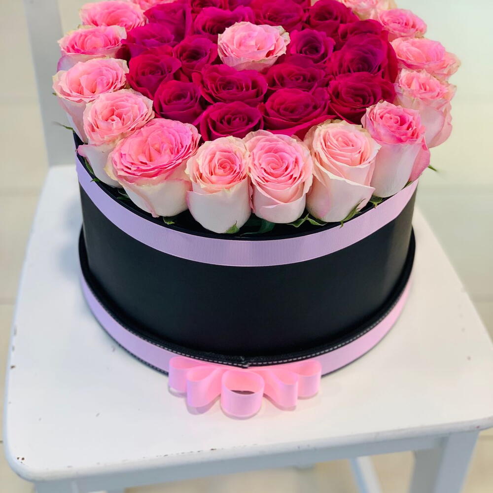 ТЁМНО-РОЗОВЫЙ РОЗОВЫЕ РОЗЫ В ЧЁРНОЙ КОРОБКЕ