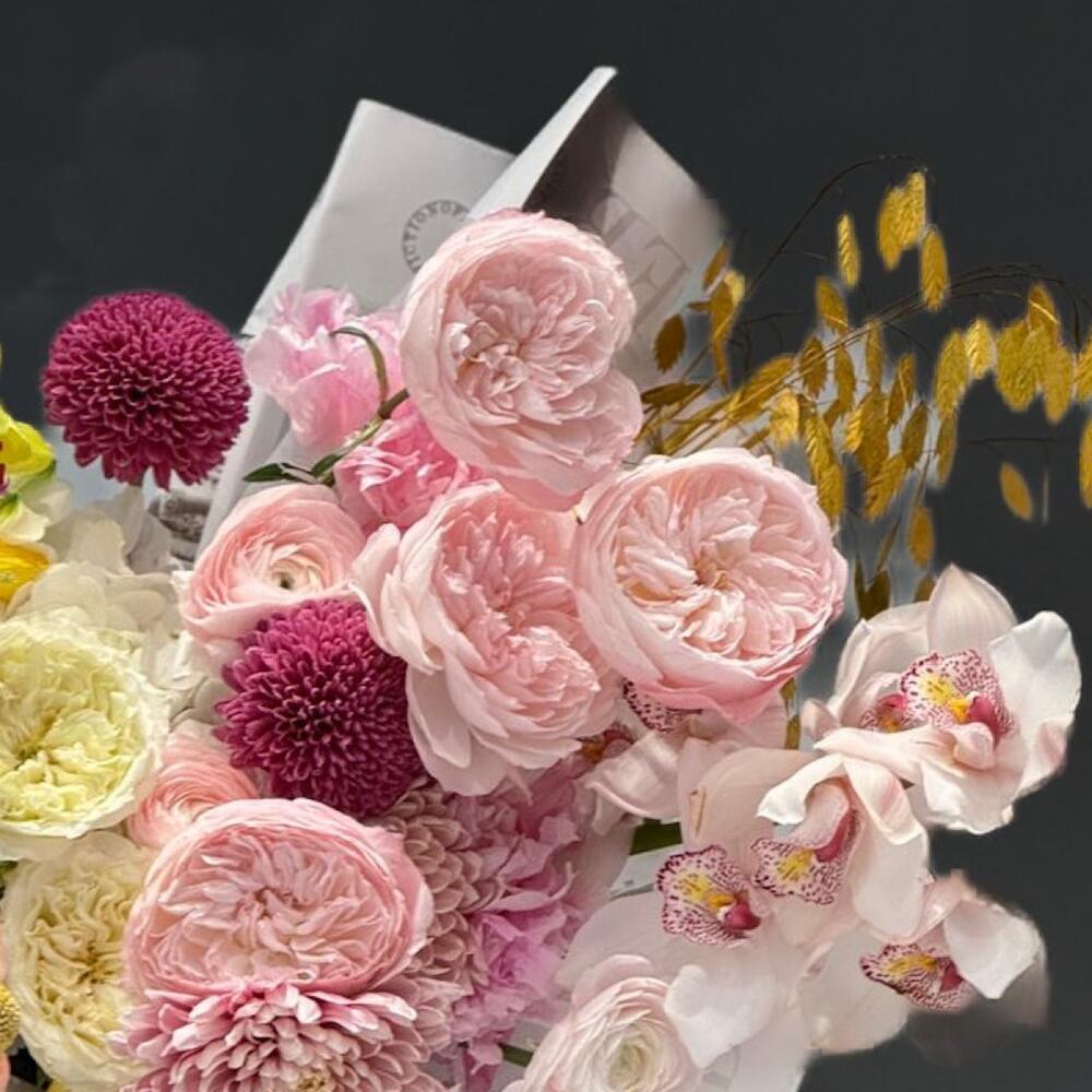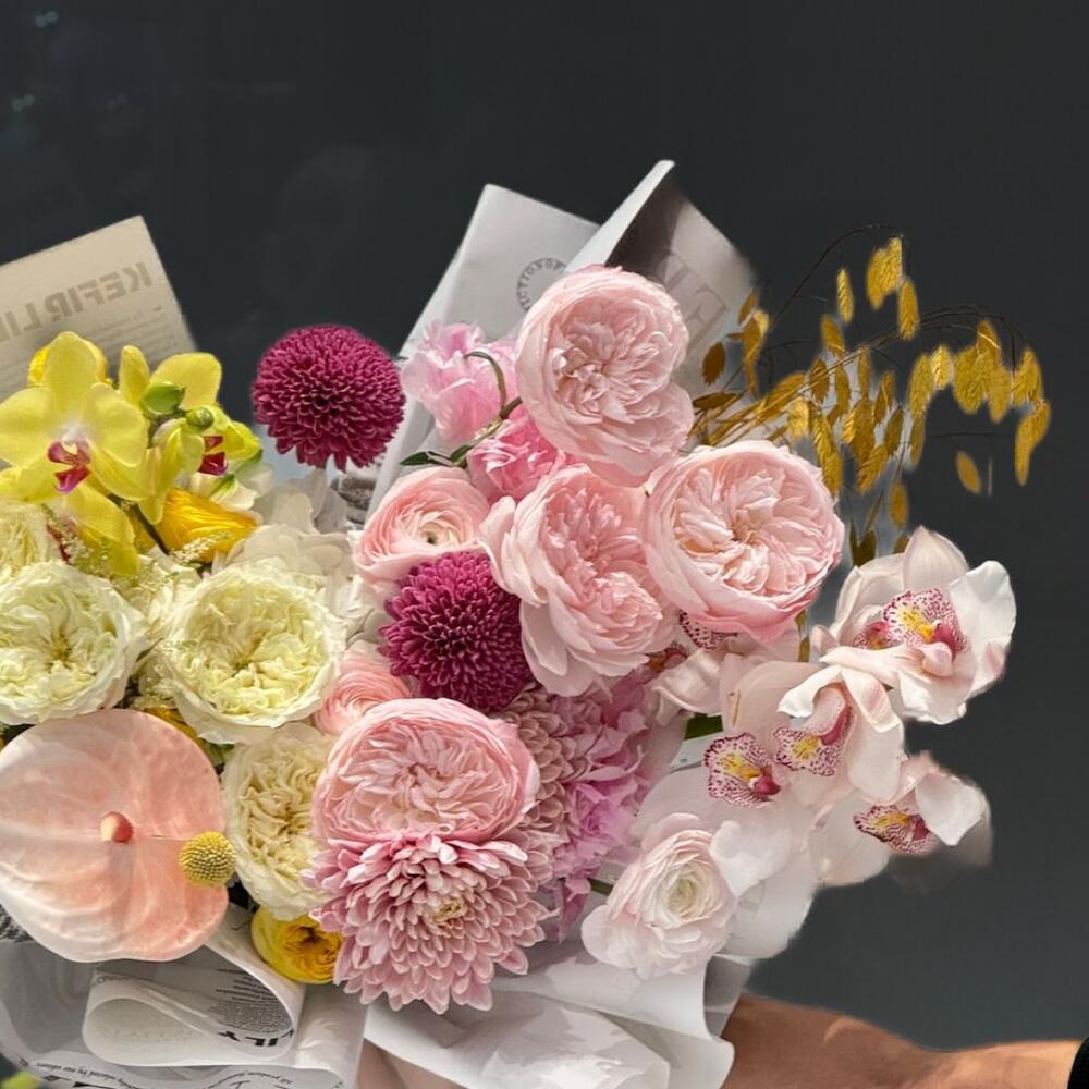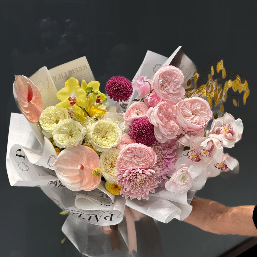 Антуриум - 3 шт. chrysanthemum single - 5 шт. ranunculus - 4 шт. wrapping paper - 4 шт. david austin rose - 12 шт. cymbidium orchids - 2 шт. романтика яркость - 3 шт. chemelaucıum - 3 шт.