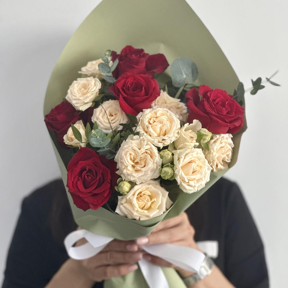 Этот элегантный букет воспевает непреходящую красоту насыщенно-красных роз, чьи роскошные бархатистые лепестки излучают романтику и изысканность. Эти классические цветы прекрасно дополняются нежными персиковыми кустовыми розами сорта Салинаро нежно-розового оттенка, которые создают нежный и теплый контраст, создавая гармоничный баланс. Букет дополняют пышные листья эвкалипта, чьи нежные серебристо-зеленые оттенки добавляют нотку свежести и текстуры, а веточки фисташки, вплетающиеся в композицию, придают глубокий зеленый оттенок и создают ощущение естественности и органичности. Сочетание страстных красных роз, нежных персиковых кустовых роз и зелени создает потрясающий, динамичный букет, идеально подходящий для празднования любви, благодарности или любого особого случая.