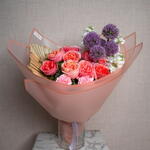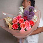 matthiola - 3 шт. ribbon satin - 1 шт. pink carnation - 5 шт. allium - 5 шт. palm leaves - 3 шт. розовая роза садового типа "Экспрессия" - 9 шт. украшение упаковки - 5 шт. листья фисташки - 5 шт.