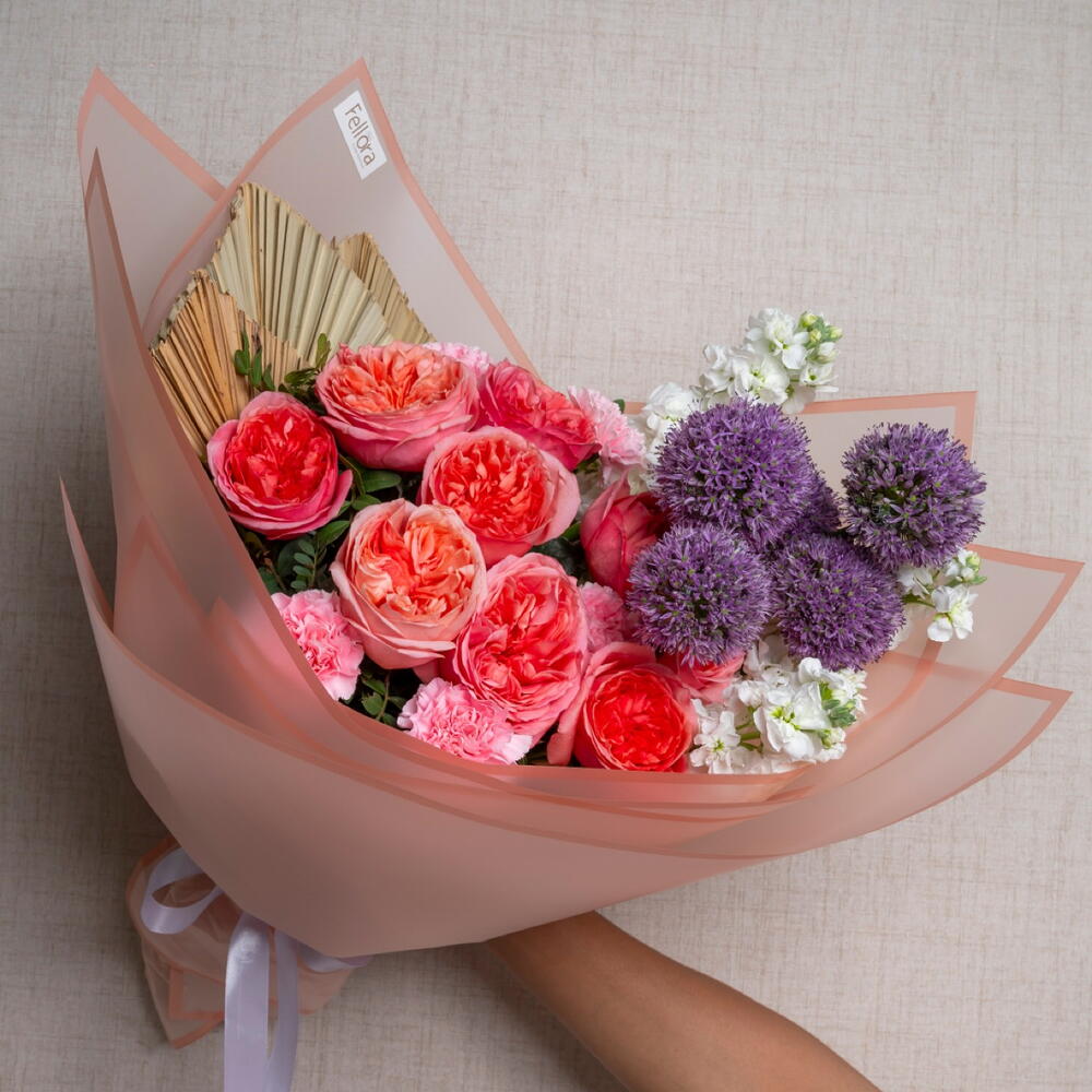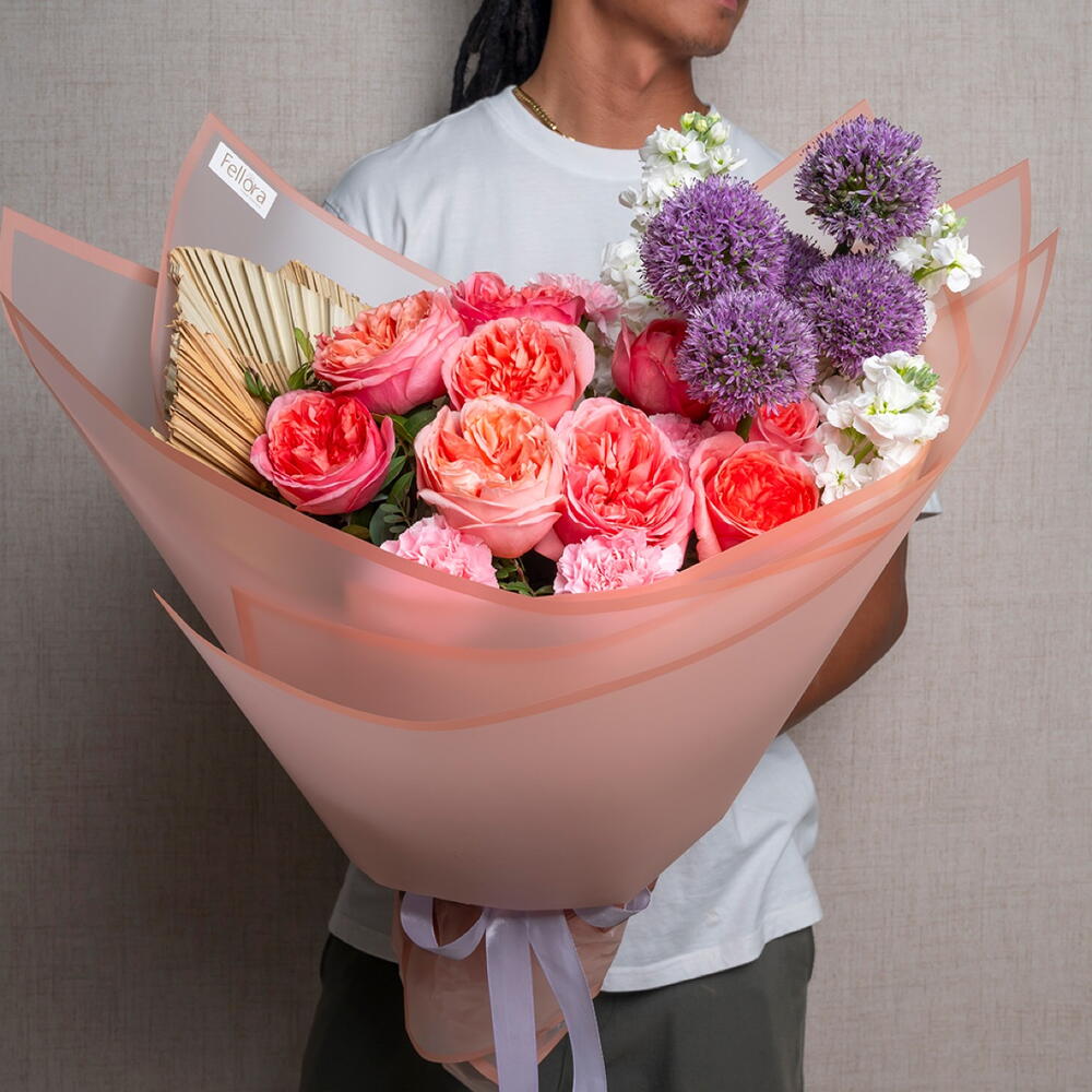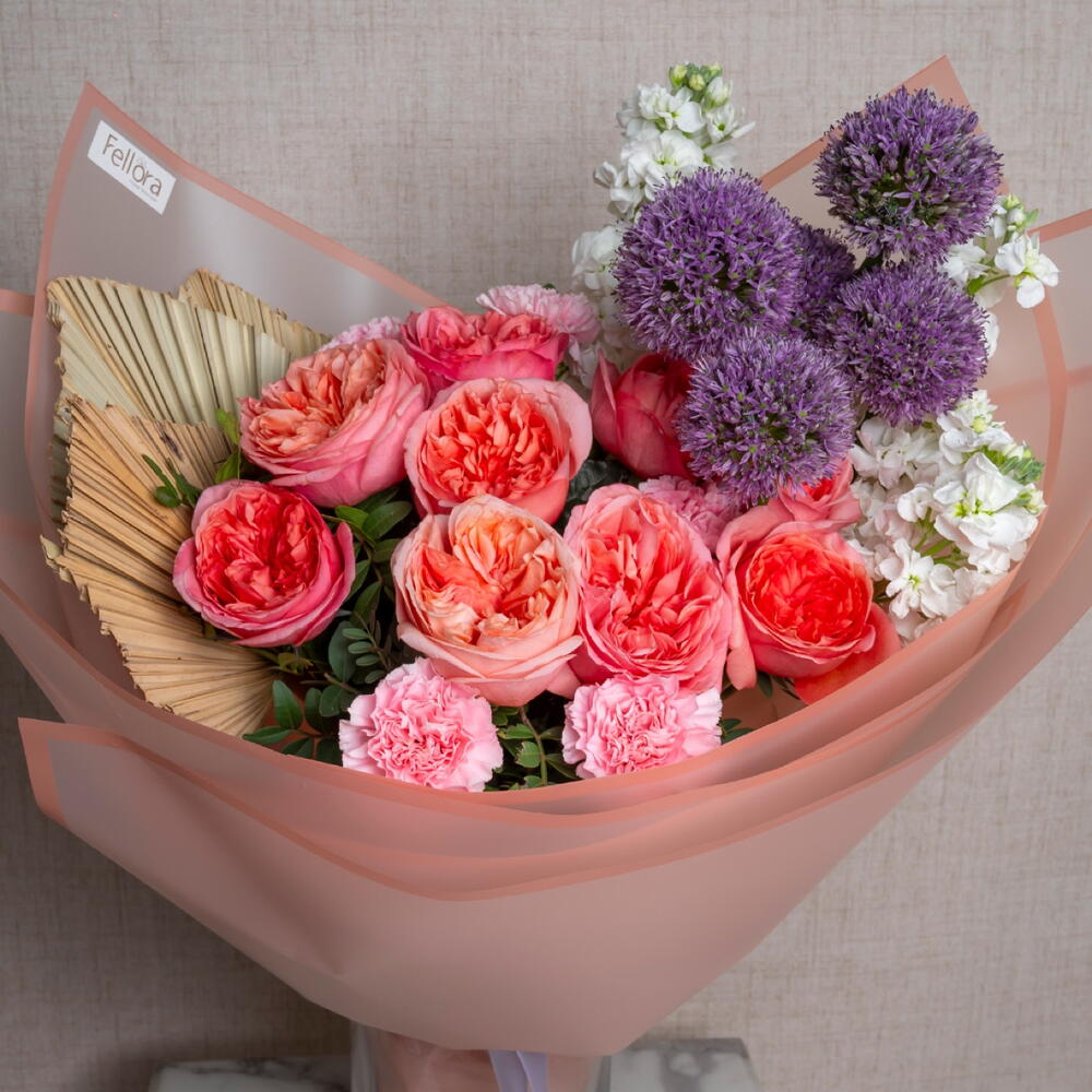 matthiola - 3 шт. ribbon satin - 1 шт. pink carnation - 5 шт. allium - 5 шт. palm leaves - 3 шт. розовая роза садового типа "Экспрессия" - 9 шт. украшение упаковки - 5 шт. листья фисташки - 5 шт.