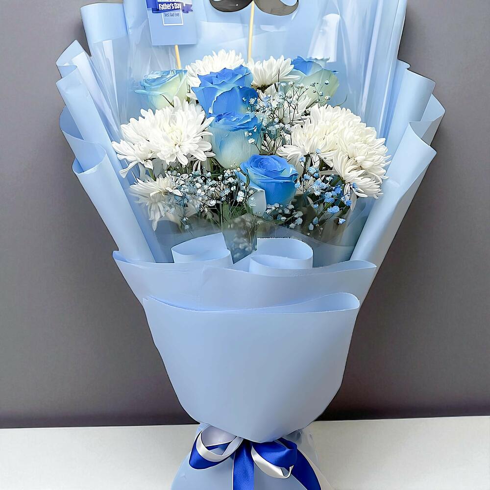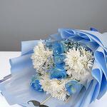 Gypsophila - 5 шт. Chrysanthemum white - 10 шт. синие розы окрашенные спреем - 6 шт.