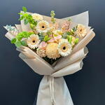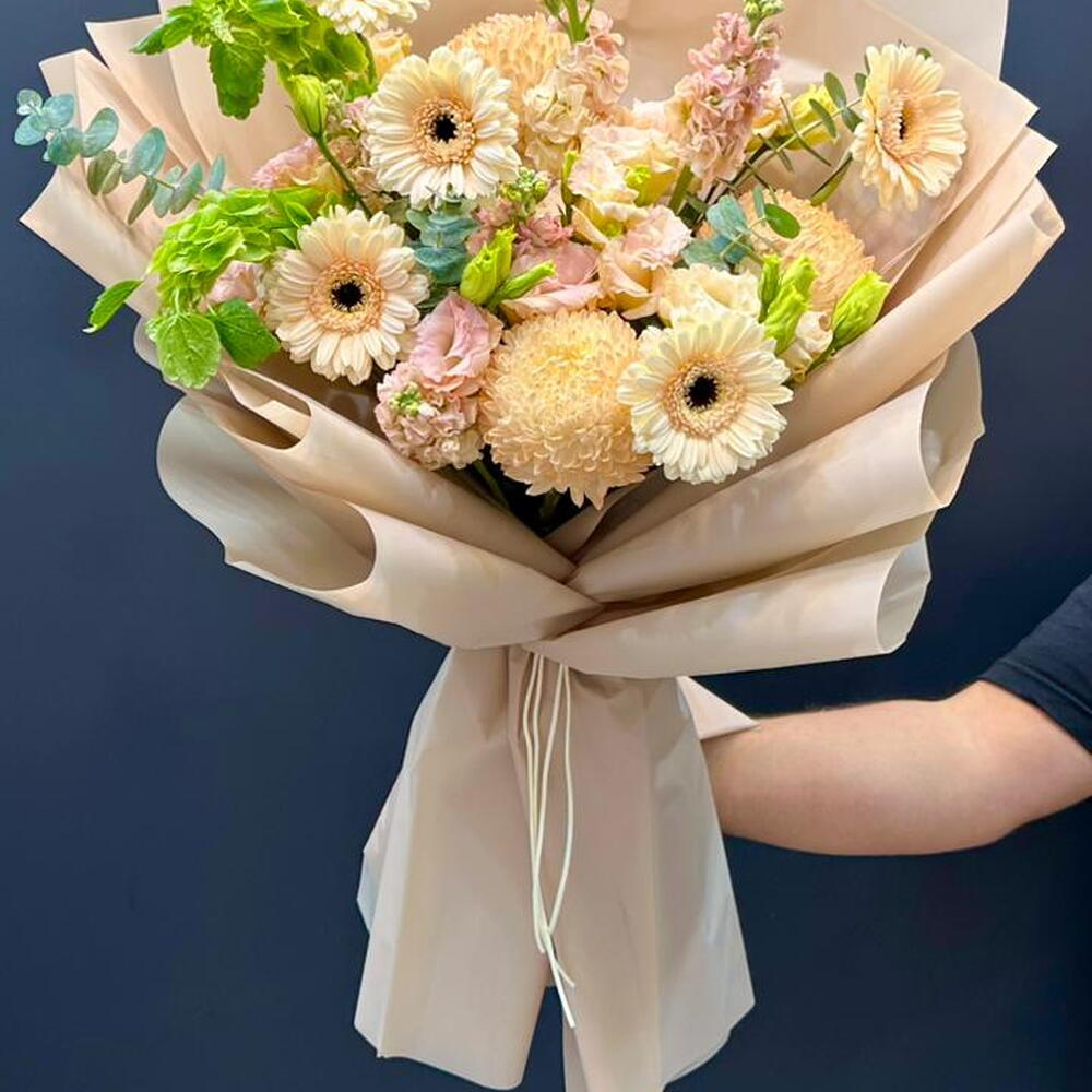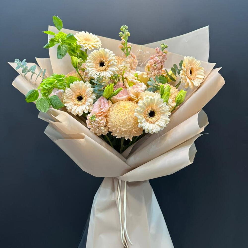 ДЕКО 3 ЭУСТОМА 3 ГЕРБЕРА 5 МАТТИОЛА 3 В БУКЕТЕ 300 AED..