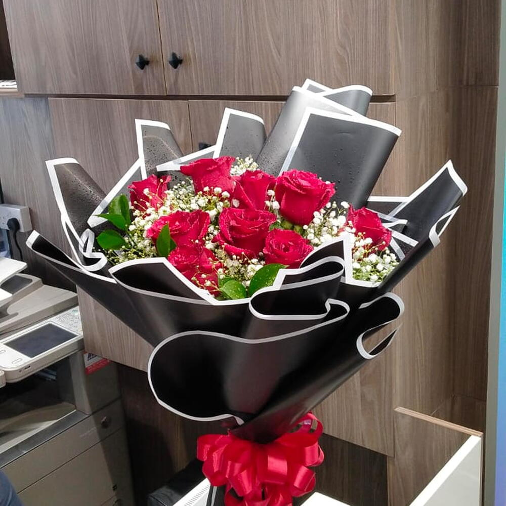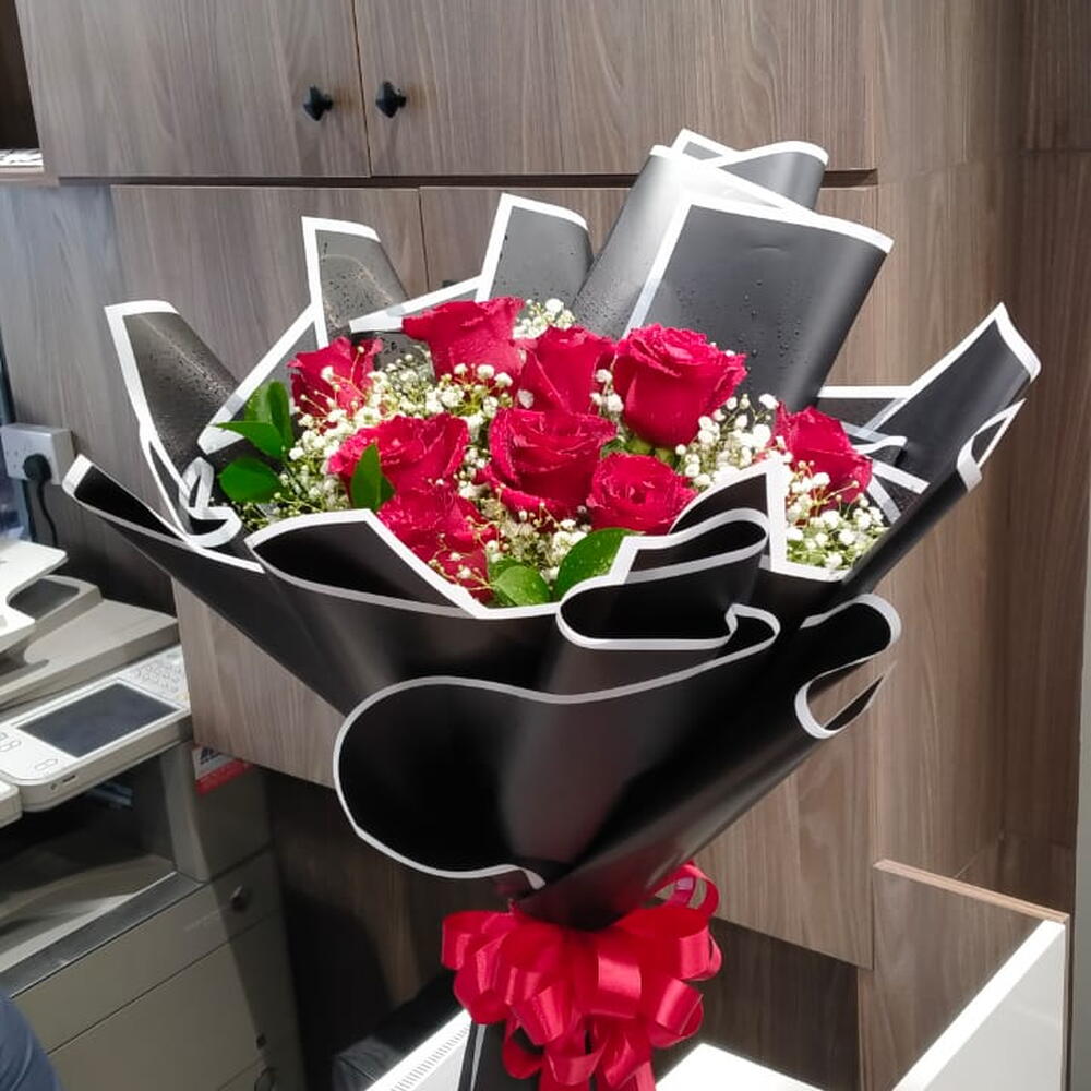 Ruscus - 5 шт. Gypsophila - 3 шт. черная упаковка - 7 шт. red roses - 10 шт.