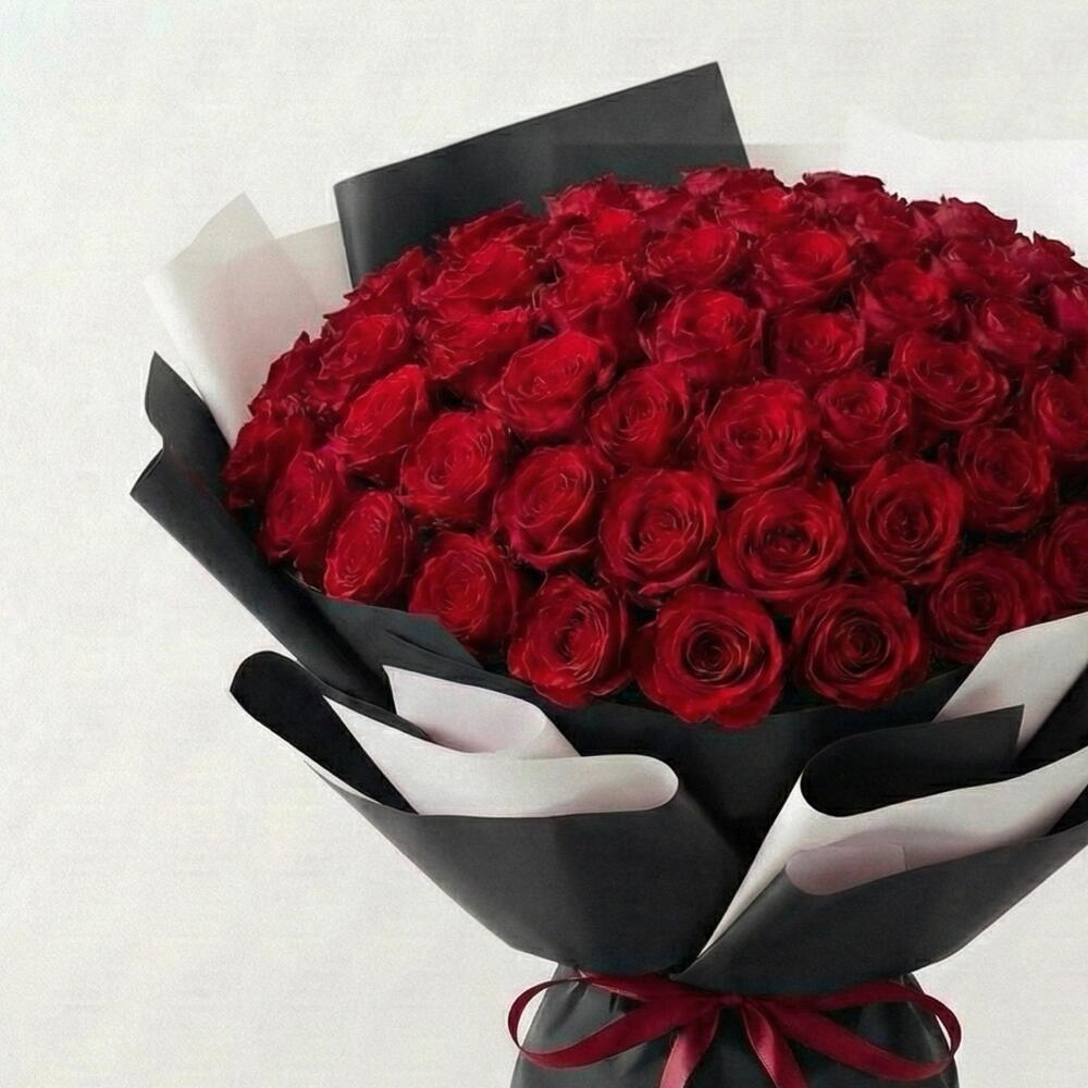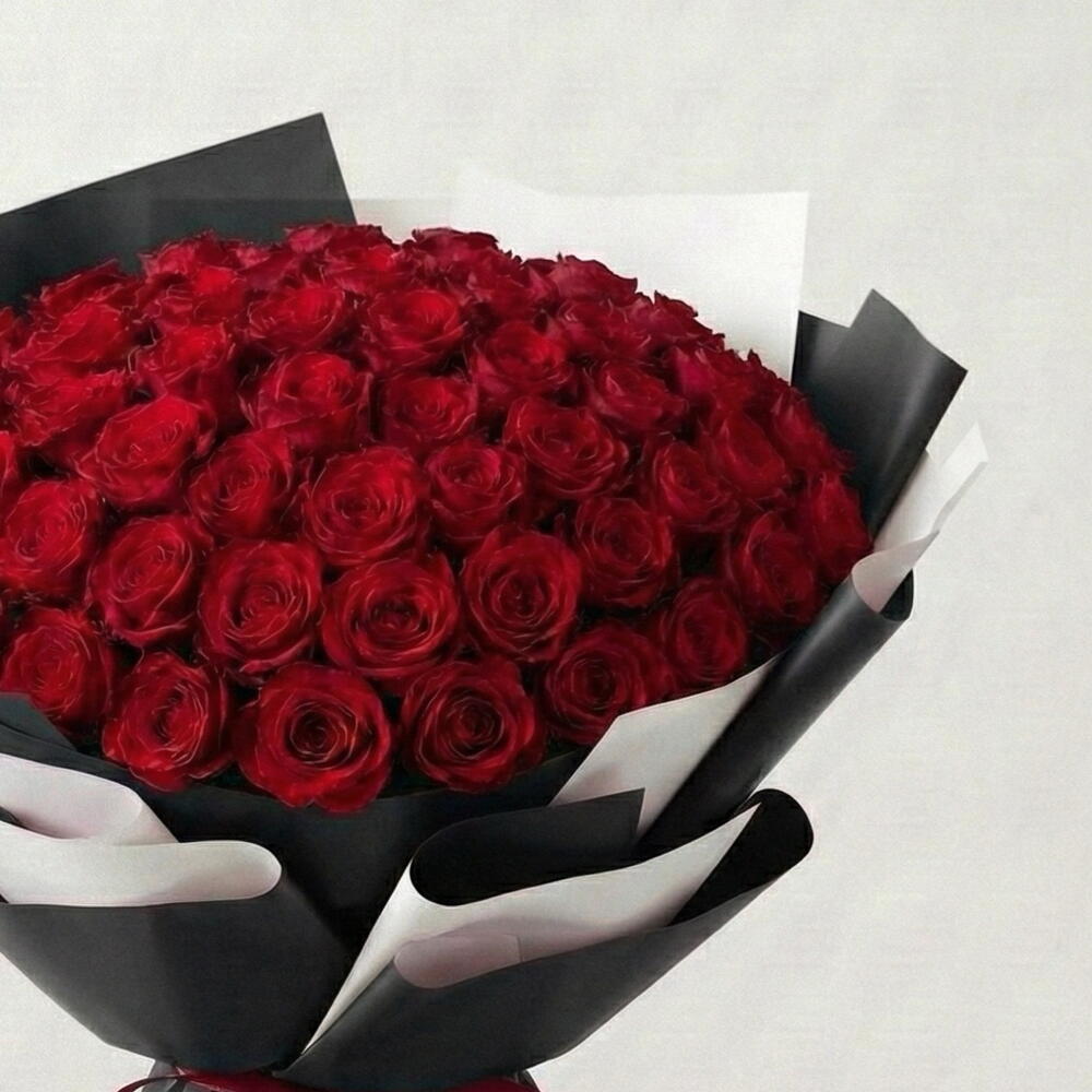 51 красная роза в черно-белой упаковке Описание Смелый контраст страсти и элегантности — 51 красная роза премиум-класса в эффектной черно-белой упаковке. Этот букет сочетает в себе вневременную романтику и современный минимализм, делая его незабываемым с первого взгляда. Идеально подходит для: • Дня святого Валентина ❤️ • Предложений руки и сердца на годовщину • Роскошных подарков • Когда вы хотите сказать «только ты» без лишних слов Примечания к стилю • Количество роз: 51 свежая красная роза • Упаковка: Черно-белая бумага премиум-класса • Атмосфера: Элегантная • Современная • Впечатляющая • Отделка: Аккуратные складки с изящной лентой