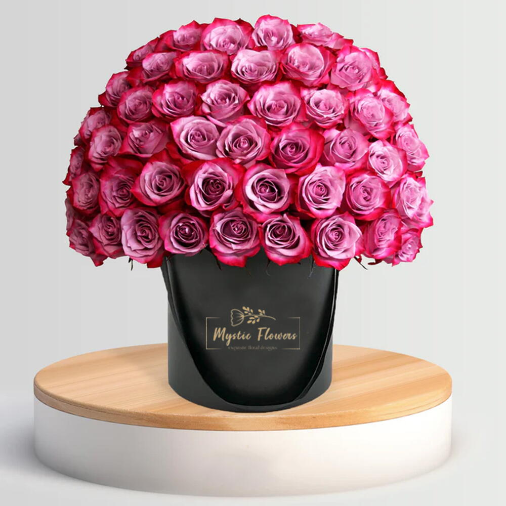 Эта шляпная коробка Deep Purple Blooms — чистая декларация роскоши — ультрапышный букет роз, оформленный как элегантный Roses in a Box. Наполненный премиальными пурпурными / лавандовыми розами (великолепный букет роз — вид букета из роз), дизайн в стиле моно-букета дарит насыщенный цвет, романтику и эффект «вау» с любого ракурса. Стильная чёрная коробка подчёркивает цветы, создавая современный премиальный букет, идеально подходящий для подарка. Это идеальная коробка для дня рождения и незабываемый подарок на день рождения, но она также прекрасно подходит как лучшие цветы для годовщины, для предложения руки и сердца и для особенных сюрпризов «Я тебя люблю». Если вы ищете модный букет, который выглядит смело и уникально, это свежий выбор букета, мгновенно повышающий статус любого момента — делая его одним из лучших вариантов букетов в Дубае для современной романтики и празднования.