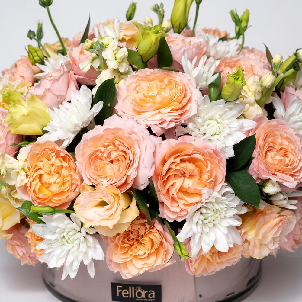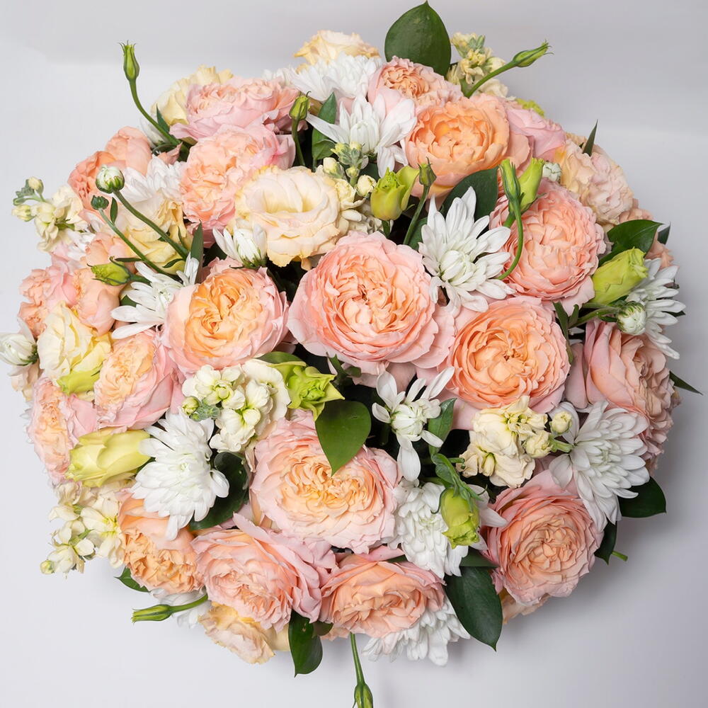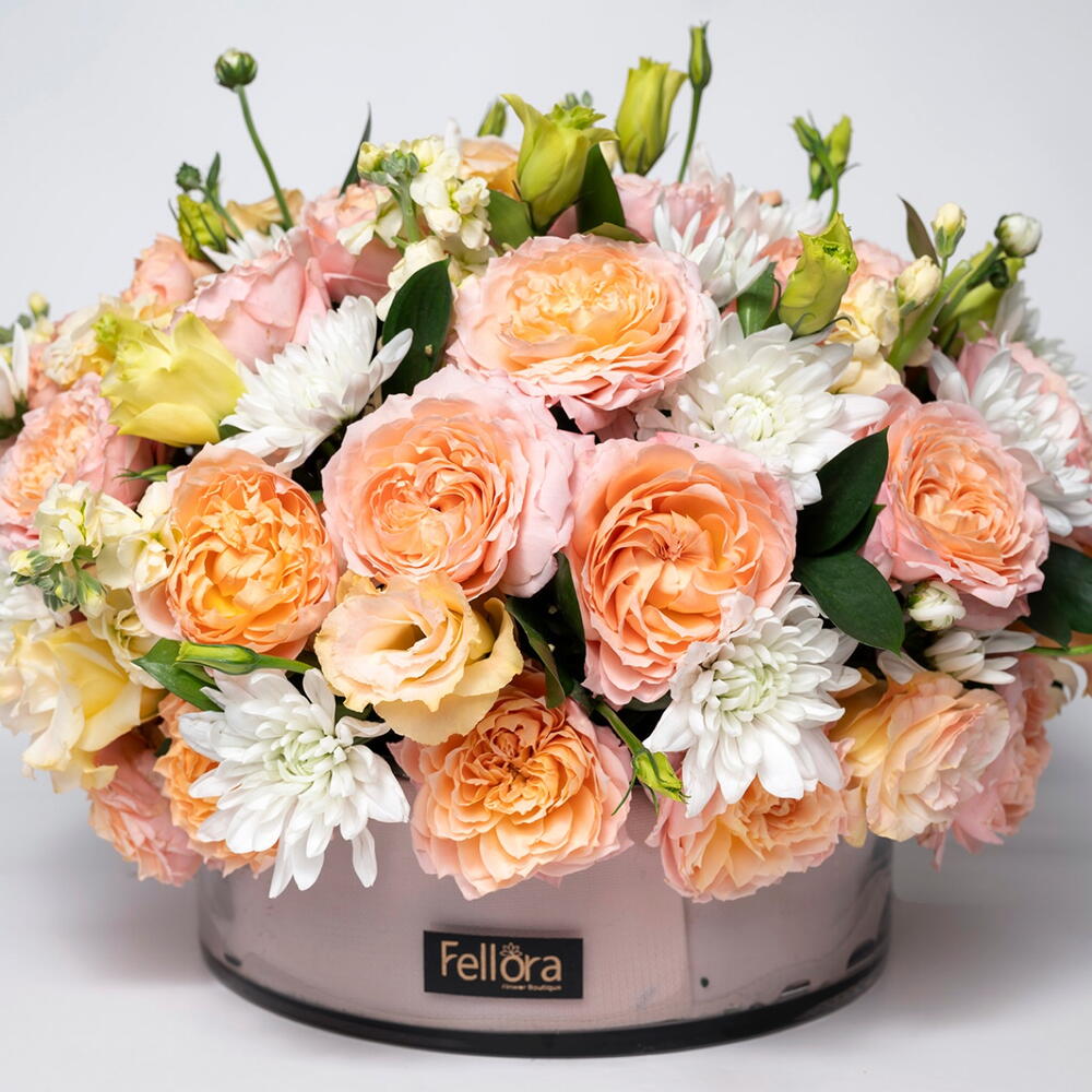 Ruscus - 6 шт. Chrysanthemum - 5 шт. Lisianthus - 5 шт. mathiola - 6 шт. круглая стеклянная ваза - 1 шт. премиальная роза julieta - 8 шт.