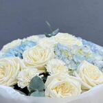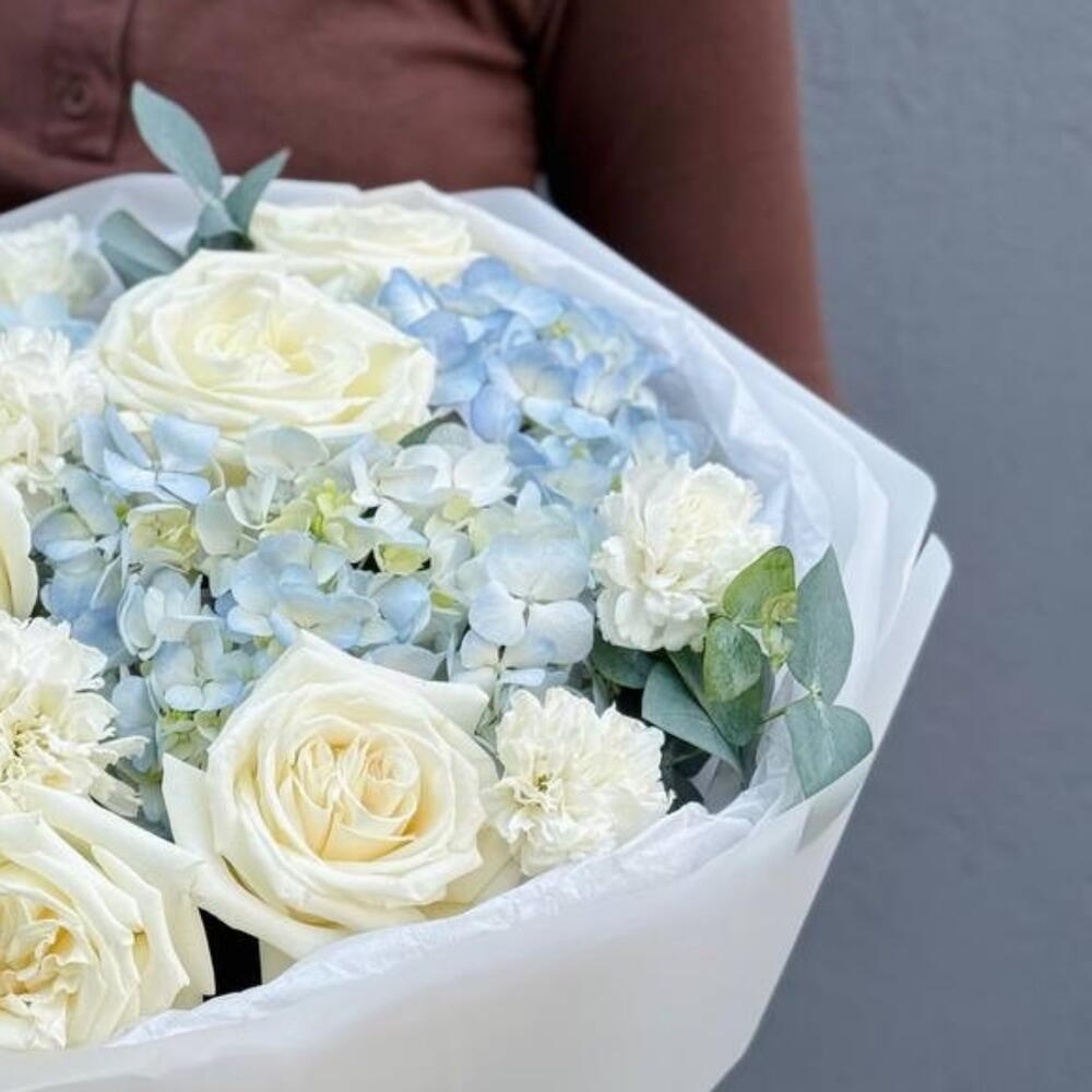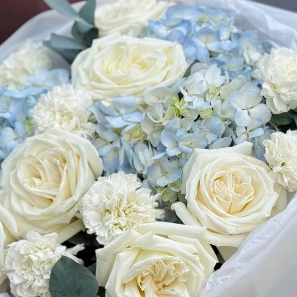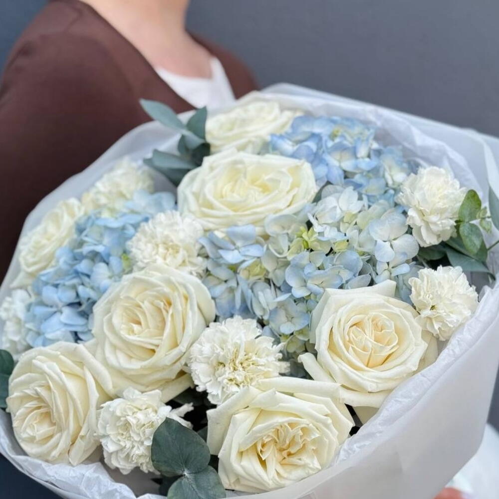 White rose - 10 шт. white carnations - 8 шт. blue hydrangea - 3 шт. eucalyptus leaves - 5 шт.
