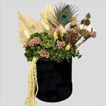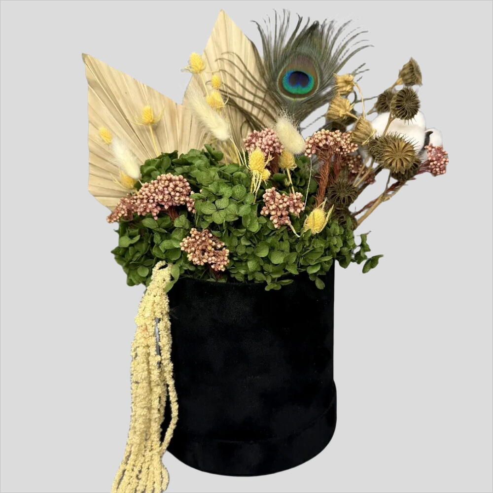 black velvet box - 1 шт. peacock feather - 1 шт. зелёная гортензия (стабилизированная) - 1 шт. сухие пальмовые листья - 2 шт. розово-лиловые сухоцветы - 5 шт. желтая сушеная цветочная трава - 3 шт. семенные коробочки ботанические материалы - 3 шт. длинный ниспадающий элемент - 1 шт.