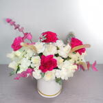 Эта эффектная и стильная современная композиция в шляпной коробке сочетает в себе яркие, ярко-розовые розы и нежные, элегантные белые цветы, создавая смелую, но изысканную композицию. Добавление воздушных сухих элементов и нежных текстур придаёт композиции современный, художественный вид. Идеально подходит для модных подарков, корпоративных мероприятий или для того, чтобы оживить интерьер ярким ярким акцентом. Чтобы композиция оставалась свежей, следите за тем, чтобы флористическая губка внутри коробки оставалась влажной, добавляя чистую прохладную воду каждые 1-2 дня. Держите композицию вдали от прямых солнечных лучей, источников отопления или кондиционирования, а также от сквозняков. Аккуратно удаляйте увядающие цветы, чтобы сохранить стильный вид букета.