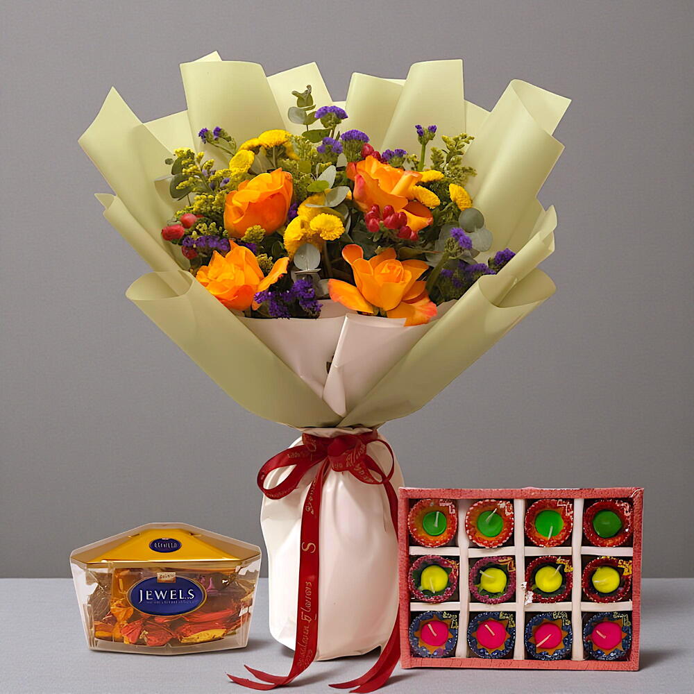 Праздничный набор, включающий яркий букет из 4 оранжевых роз и 3 жёлтых хризантем с сезонными наполнителями, в комплекте с коробкой шоколадных конфет Jewels весом 200 г и красивым набором из 12 восковых диа. Идеальный подарок, чтобы поделиться светом, сладостью и радостью в этот Дивали.