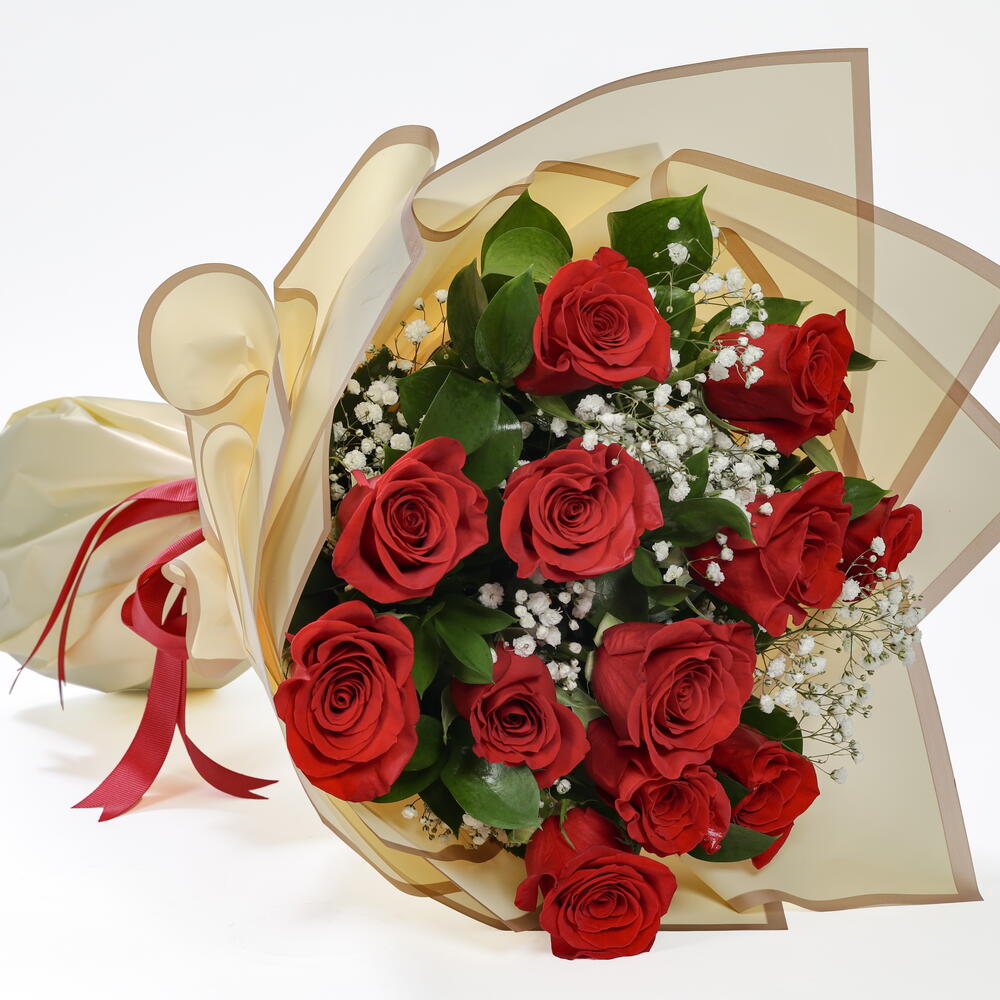 Ручной букет из 12 красных роз, 2 веток гипсофилы и 5 листьев рускуса