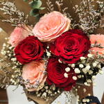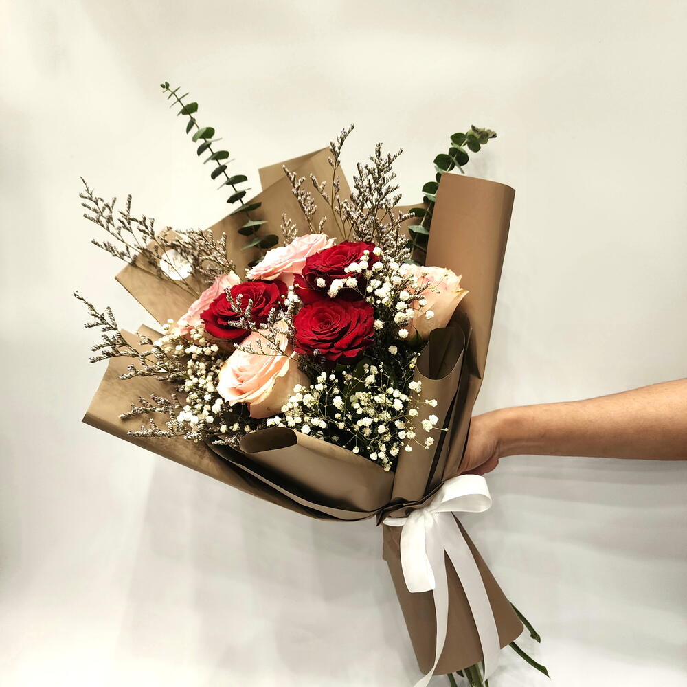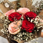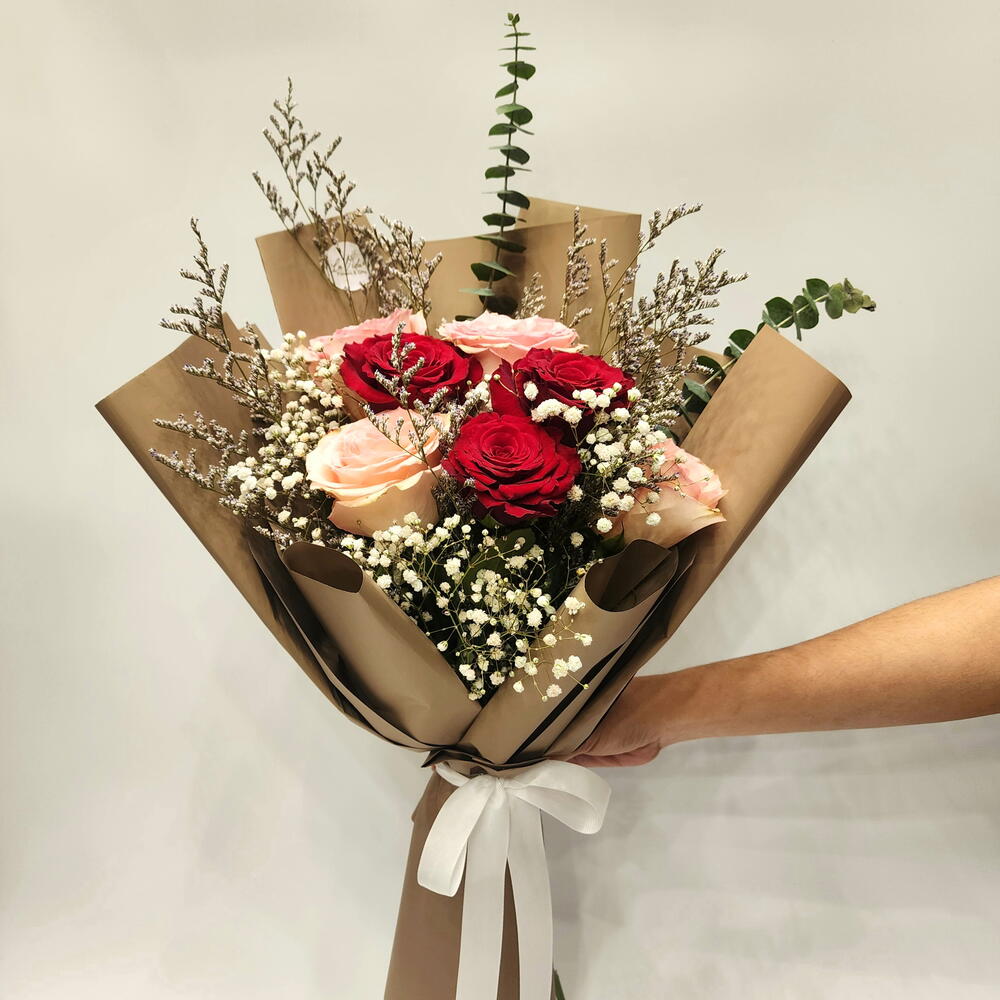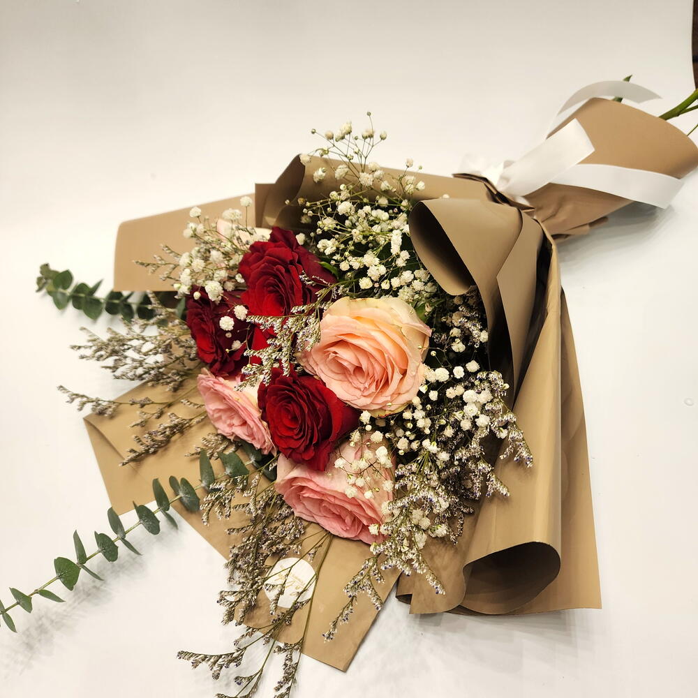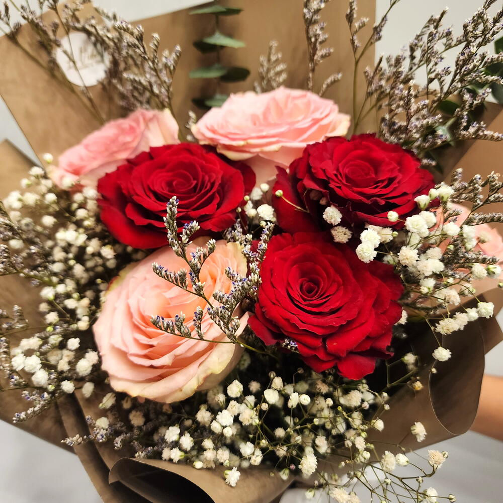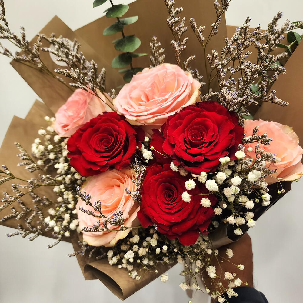 wrapping paper - 2 шт. лимониум пурпурный - 2 шт. дыхание младенца - 3 шт. свежие красные розы - 3 шт. свежие розовые розы - 4 шт.