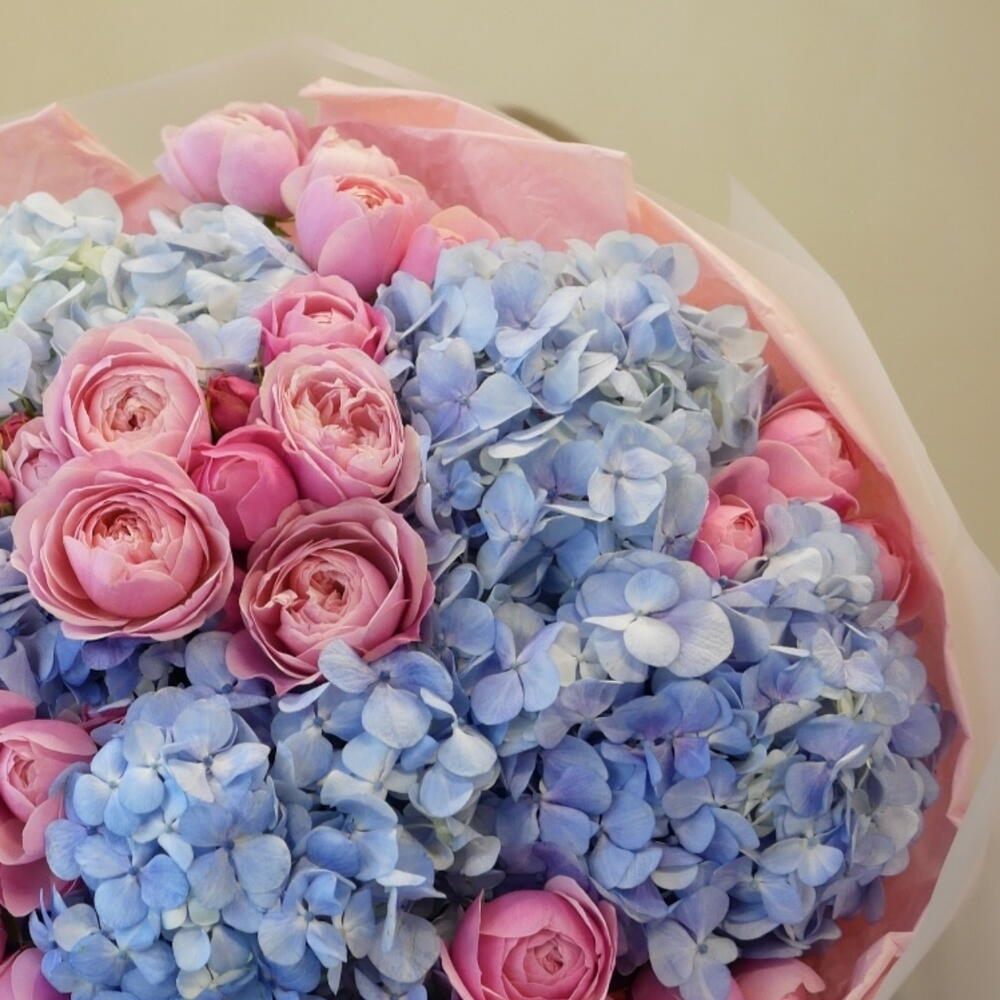 Dream Floral _ Букет на день рождения с голубой гортензией и розовыми пионами