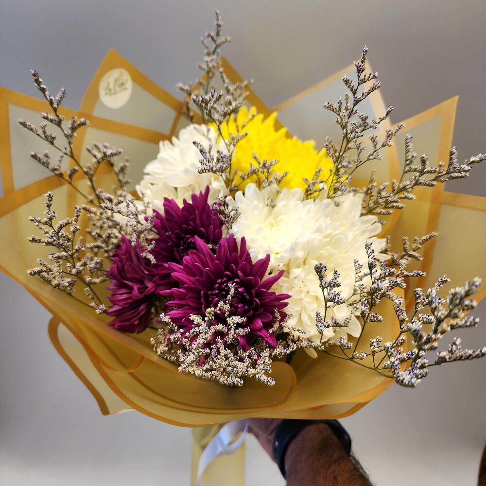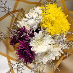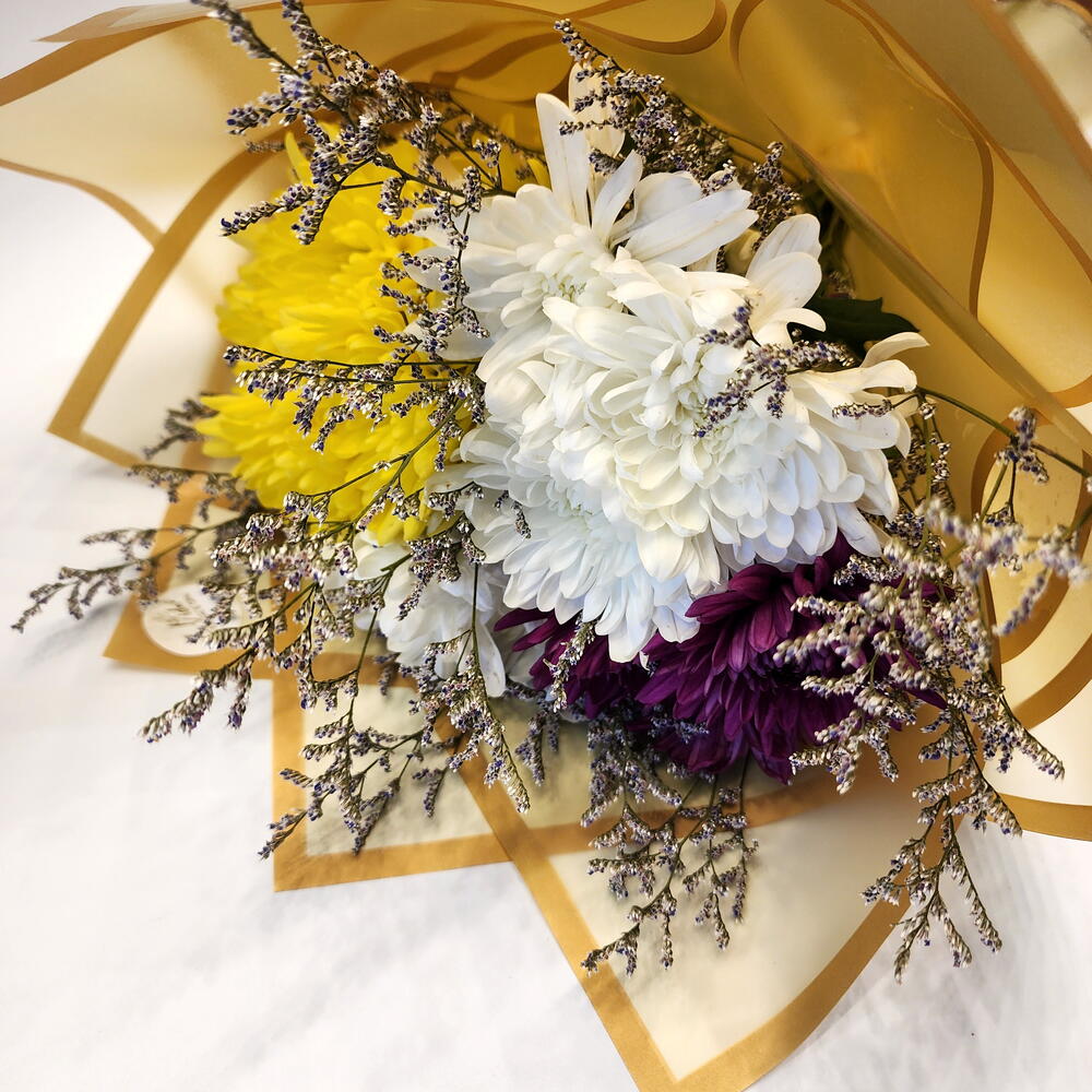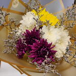 Limonium - 1 шт. white chrysanthemum - 6 шт. yellow chrysanthemum - 3 шт. purple chrysanthemum - 3 шт. wrapping paper - 2 шт.