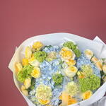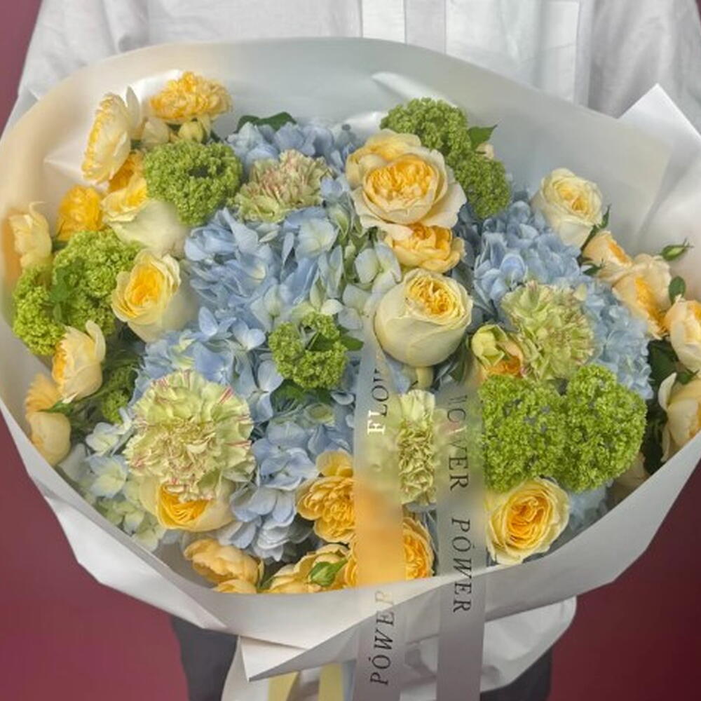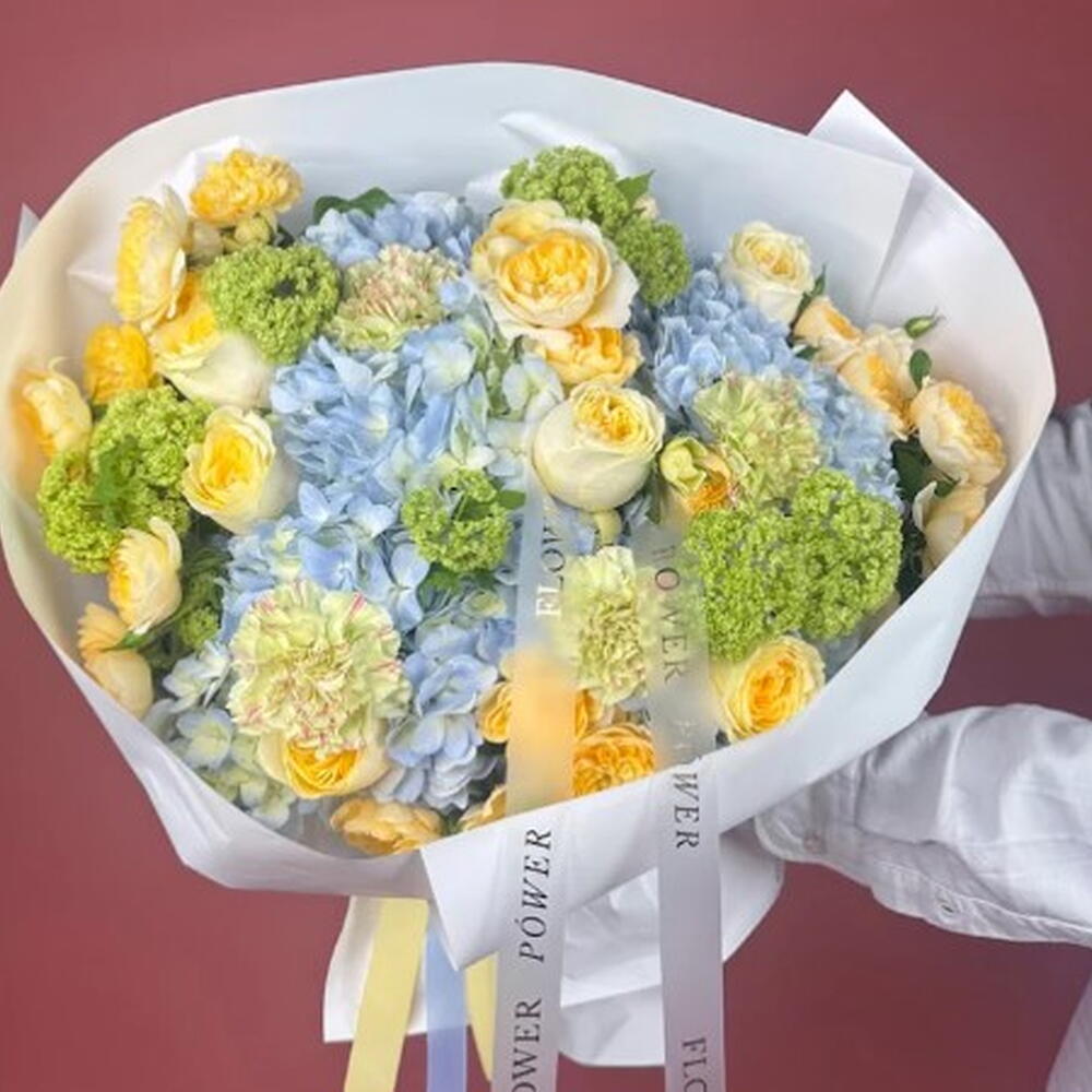 Viburnum - 5 шт. жёлтая кустовая роза - 5 шт. hydrangea light blue - 3 шт. набор - 1 шт. гвоздика светло-зелёная - 5 шт. розовый кремовый жёлтый - 9 шт.