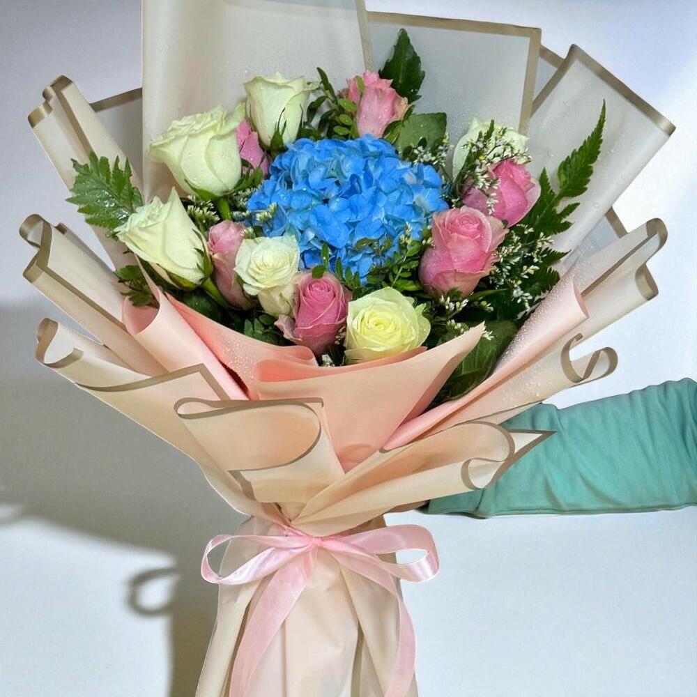 Нежный пастельный букет: 1 синяя гортензия и 12 розовых и белых роз в красивой упаковке