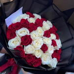 Букет представляет собой эффектную, современную композицию из красных и белых роз, оформленную в лаконичную черную оберточную бумагу и перевязанную смелой красной лентой. Розы плотно уложены по кругу, создавая драматичный контраст между насыщенно-красными бутонами и безупречно белыми, которые сливаются в изящную, привлекающую внимание композицию. Матовая черная бумага придаёт аранжировке дерзкий, роскошный характер, а красная лента добавляет нотку классического романтизма, делая всю композицию похожей на модный цветочный акцент.