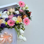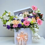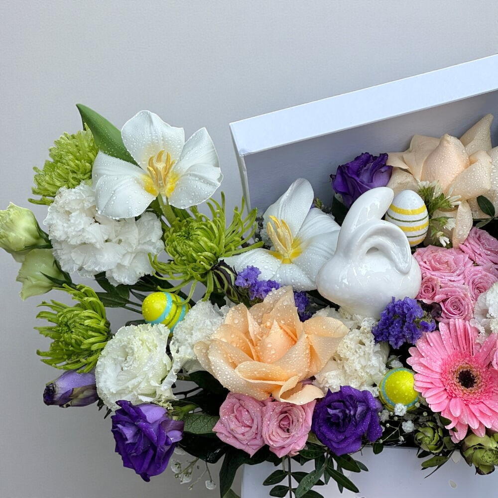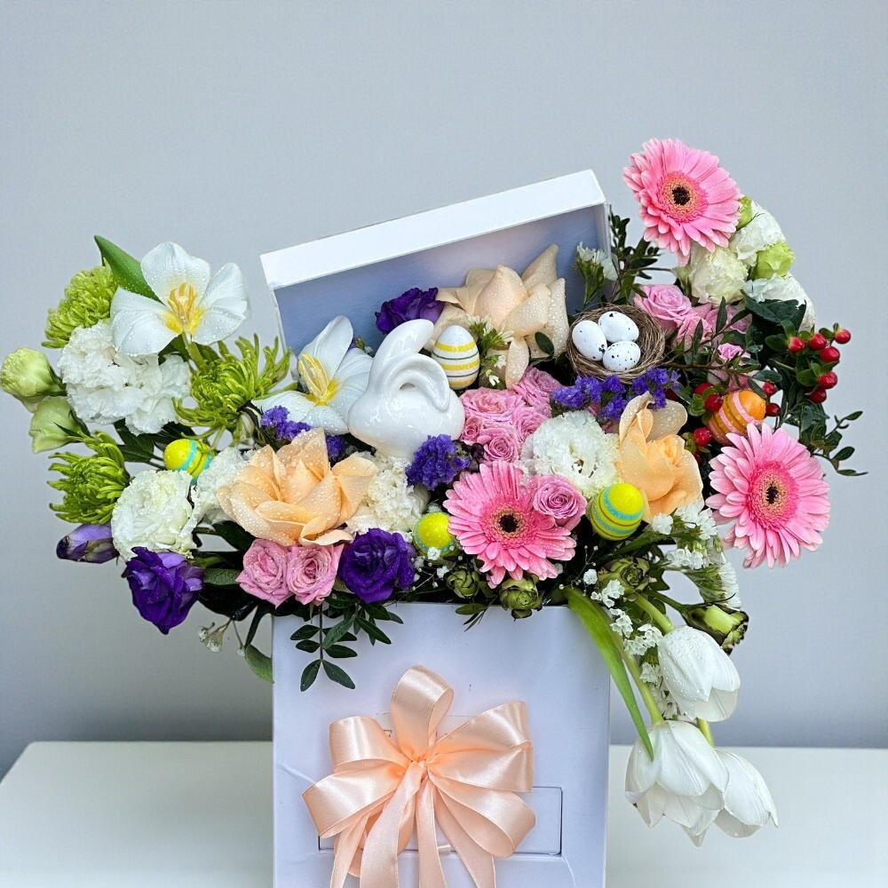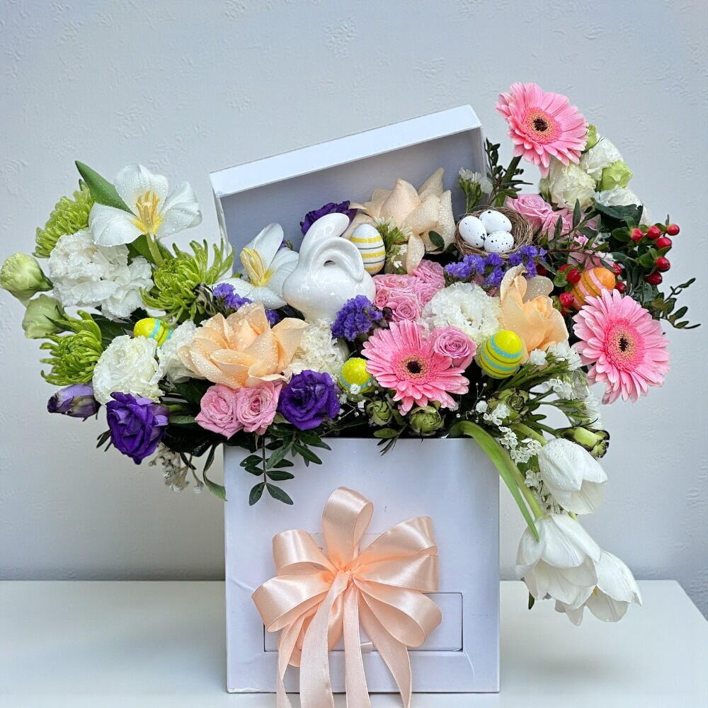 Изящная композиция в белой коробке, передающая весеннее безмятежное настроение. Композиция из 5 белых тюльпанов, 3 розовых гербер, 3 персиковых роз, 3 розовых кустовых роз, 3 белых гвоздик и 4 фиолетовых лизиантуса одновременно жизнерадостная и умиротворяющая. Дополненная очаровательным гнездом для яиц, 4 пастельными яйцами и очаровательным керамическим кроликом, композиция станет трогательным центральным элементом пасхального торжества, подарка или просто для уютного декора.