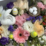Box - 1 шт. pink Gerbera - 3 шт. pink spray rose - 3 шт. peach rose - 3 шт. white tulips - 5 шт. purple lisianthus - 4 шт. белый гвоздика - 3 шт. сезонные наполнители - 5 шт. яичное гнездо - 1 шт. пастельные пасхальные яйца - 4 шт. керамический кролик - 1 шт.