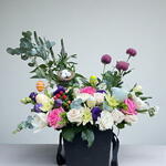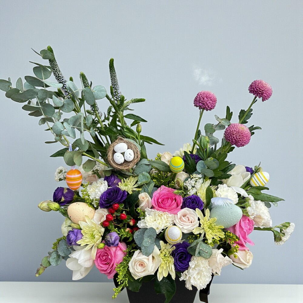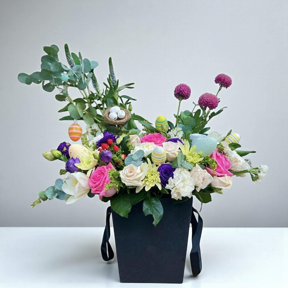 Box - 1 шт. Pink rose - 3 шт. White rose - 4 шт. white chrysanthemum - 2 шт. white tulip - 2 шт. purple lisianthus - 3 шт. белый гвоздика - 5 шт. нежные сезонные наполнители - 5 шт. помпон - 3 шт. яичное гнездо - 1 шт. пастельные пасхальные яйца - 5 шт.
