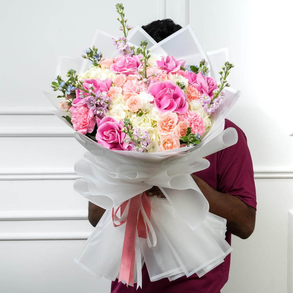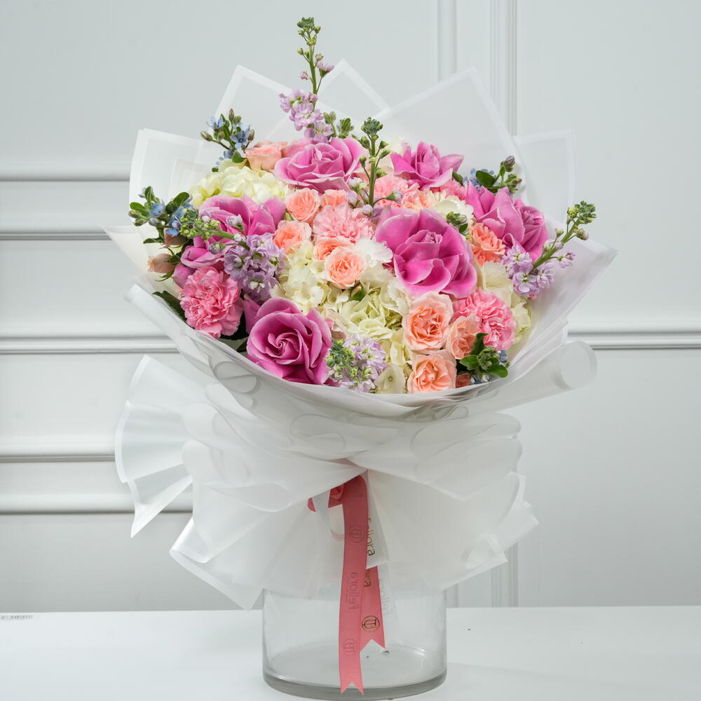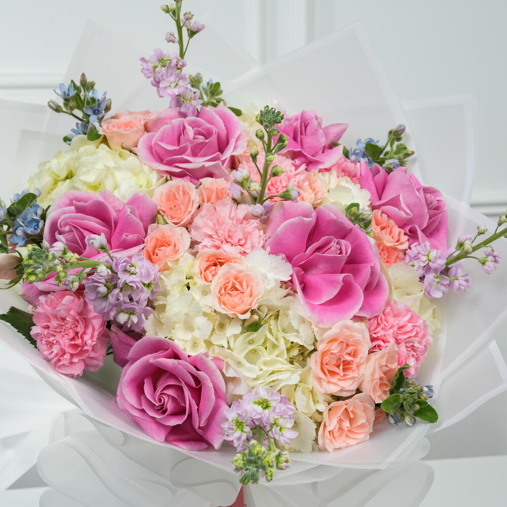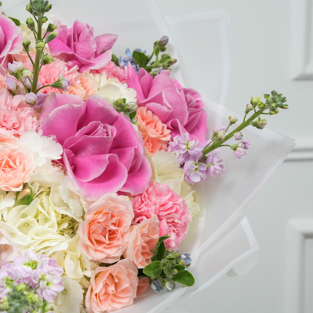 Прекрасная смесь эквадорских роз и белых гортензий в нежных румяно-розовых тонах. Оформлена мини-розами, гвоздиками и свежими сезонными цветами. Идеально подходит для дней рождения, годовщин и в качестве особого подарка. Свежие цветы аккуратно уложены для элегантного вида.