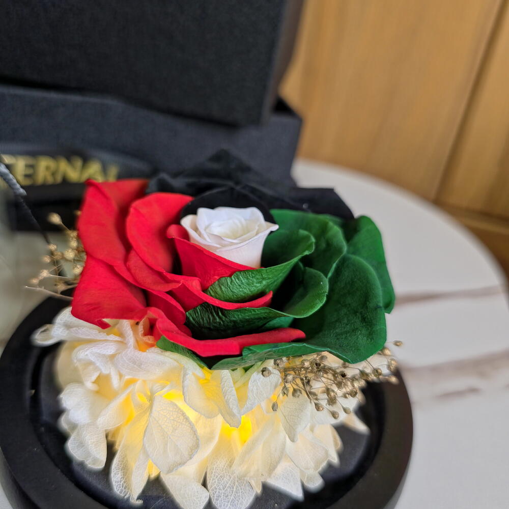 Светящаяся композиция из стабилизированных роз цветов флага ОАЭ в стеклянном куполе со светодиодной подсветкой — идеальный подарок для любого случая.