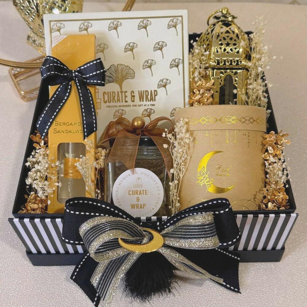 Привнесите тепло и элегантность в ваши подарки с этим премиальным праздничным набором, оформленным в насыщенных золотых и чёрных тонах. Центром композиции служит красиво выполненный золотой фонарь, дополненный коробкой гурманских фиников для традиционного акцента. Насладитесь сладким хрустом баночки карамелизированных орехов пекан и неотразимым вкусом миндальных драже в шоколаде, поданных в роскошной коробке или банке. Для полного впечатления в набор включён диффузор с тростниковыми палочками, придающий дому успокаивающий аромат. Украшенный сухоцветами и эффектным бантом, этот подарочный набор — идеальный выбор для Рамадана, Ида или особых торжеств.