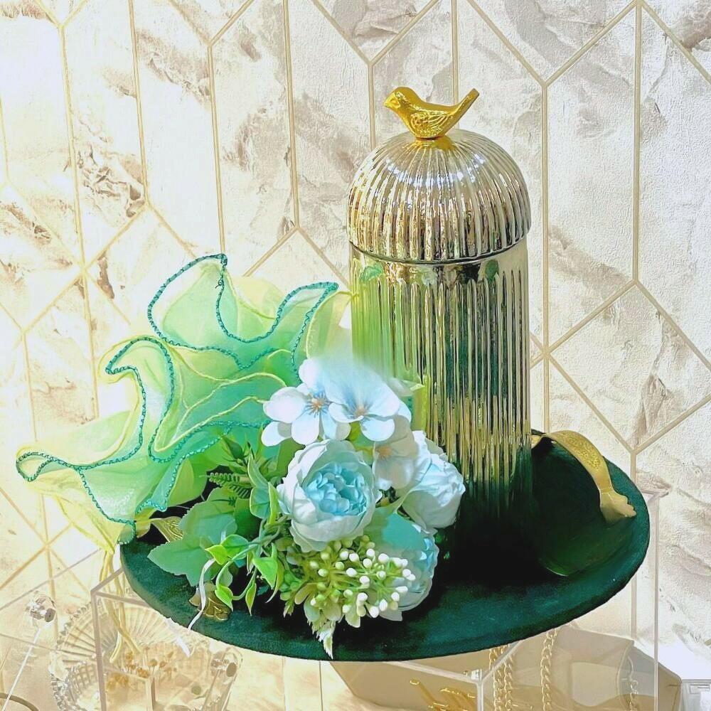 ароматическая свеча - 1 шт. искусственная роза - 2 шт. персонализированная открытка - 1 шт. переносная сумка - 1 шт. стеклянная банка с финиками - 1 шт. мешочек со смесью орехов - 1 шт. замшевый поднос - 1 шт. искусственная гортензия - 1 шт.
