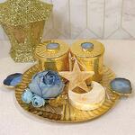 Этот роскошный подарочный набор изящно сочетает элегантность и традиции, делая его идеальным выбором для Рамадана, Ида или любого особого торжества. Композиция включает две золотые металлические баночки — в одной премиальные финики Bateel, в другой — роскошные шоколадные конфеты Patchi. Для спокойной атмосферы в набор входят свеча в форме луны и свеча в форме звезды, символизирующие праздник и свет. Поднос украшен нежными голубыми цветами и отделан мерцающими акцентами из агата, придающими естественный и утончённый шарм. Персонализированная открытка завершает ансамбль, делая его не только наслаждением для чувств, но и душевным жестом. Держите баночки запечатанными для сохранения свежести, а свечи храните в прохладном месте для лучшего использования.