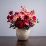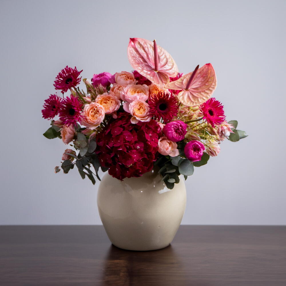 Откройте очарование этой пышной цветочной композиции из коллекции Florists Specials. Деликатно выполненная вручную из изысканных цветов, эта композиция включает 3 эвкалипта, 5 кустовых роз, 5 потрясающих гербер, 2 редких антуриума и 2 гортензии в оттенках тёмно-розового. Композиция искусно украшена поразительным количеством 230 нежно-розовых лепестков, создающих чарующую эстетику. Сочетание ярких цветов и прекрасных текстур привносит нотку красоты природы в любое пространство. Прекрасный подарок для любителей растений и великолепное дополнение к любому интерьеру!