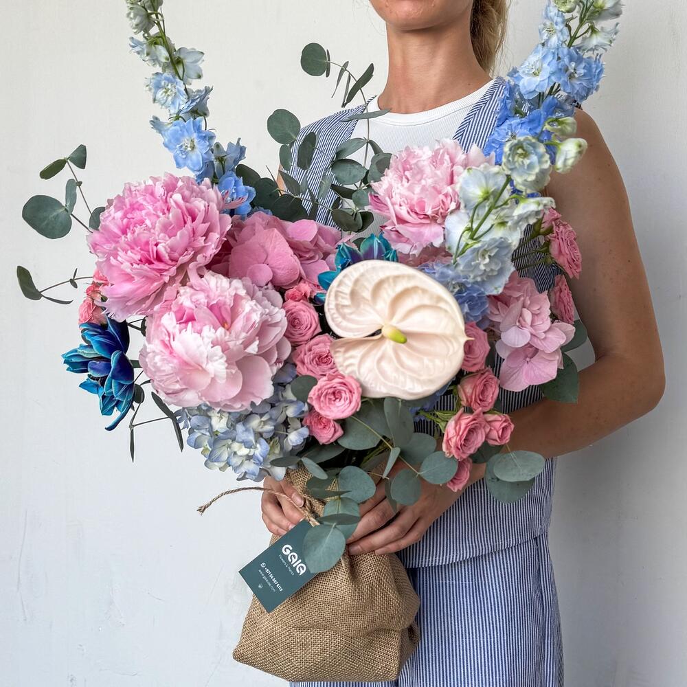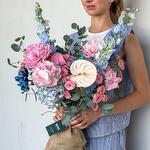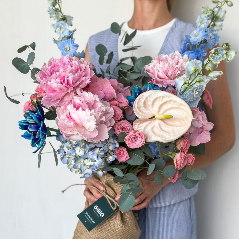 Eucalyptus - 3 шт. Tulips - 3 шт. Антуриум - 1 шт. Peony - 3 шт. delphinium - 3 шт. spray rose pink - 4 шт. гортензии голубые - 1 шт. гортензии розовые - 2 шт.