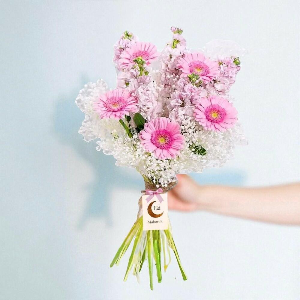 Отпразднуйте Ид элегантно с этим очаровательным букетом нежно-розовых гербер, пышных сезонных цветов и воздушной гипсофилы. Нежные пастельные тона дарят ощущение покоя, радости и праздничного настроения, что делает его идеальным подарком для близких в этот особенный праздник. Связанный вручную с заботой и украшенный биркой «Ид Мубарак», этот букет одновременно изящен и душевен. Чтобы цветы дольше оставались свежими, поместите их в чистую вазу, наполненную свежей водой, меняйте воду ежедневно и слегка подрезайте стебли каждые два дня. Держите вдали от прямых солнечных лучей и сквозняков, чтобы сохранить их красоту. Простой, но впечатляющий подарок, который передаёт суть любви, благодарности и торжества.