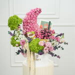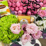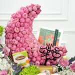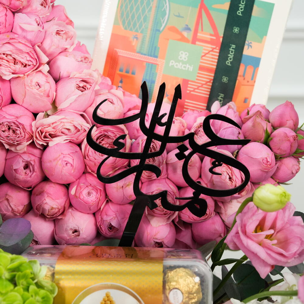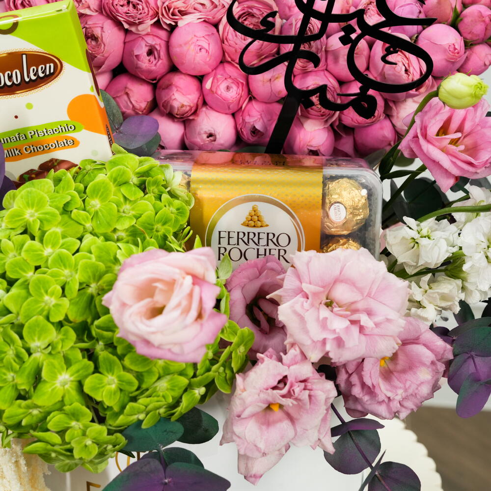 Celebrate Eid in luxury with this stunning floral and chocolate gift box, beautifully arranged in a big white box (60cm height × 45cm width). Featuring lush pink peony spray roses (each stem blooming with 4–5 delicate flowers), green hydrangeas, white matthiola, pink lisianthus, elegant white amaranthus, and fresh eucalyptus for a rich and graceful look. Paired with premium treats including Kunafa chocolate, UAE Monuments Box by Patchi, and a box of 16 Ferrero Rocher, this arrangement is finished with a special Eid Mubarak topper. A perfect luxury Eid gift to express love, blessings, and celebration in the UAE.