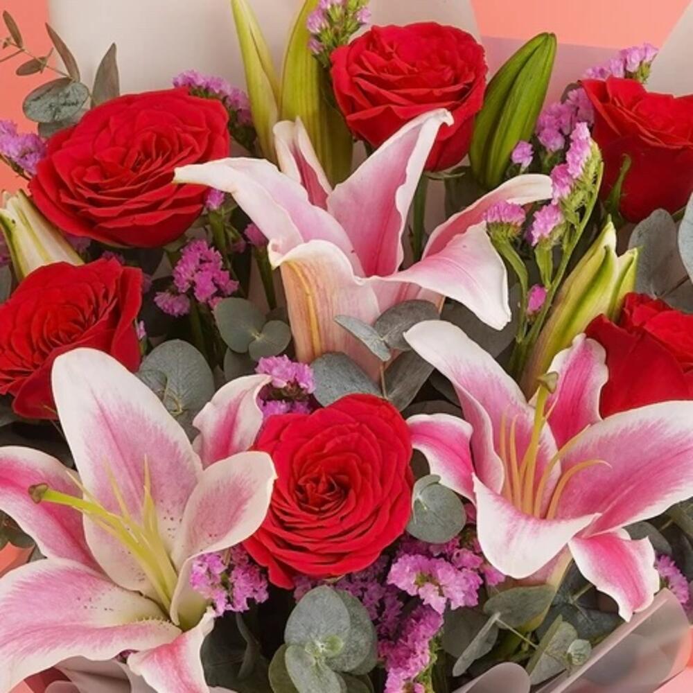 Eucalyptus - 5 шт. розовая лилия - 2 шт. red roses - 7 шт. розовая статика - 2 шт.