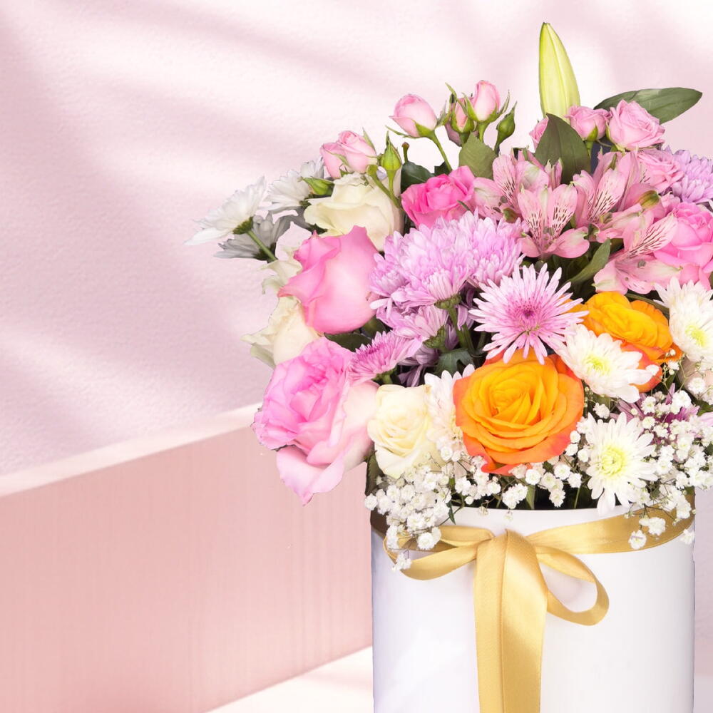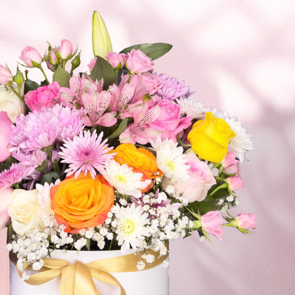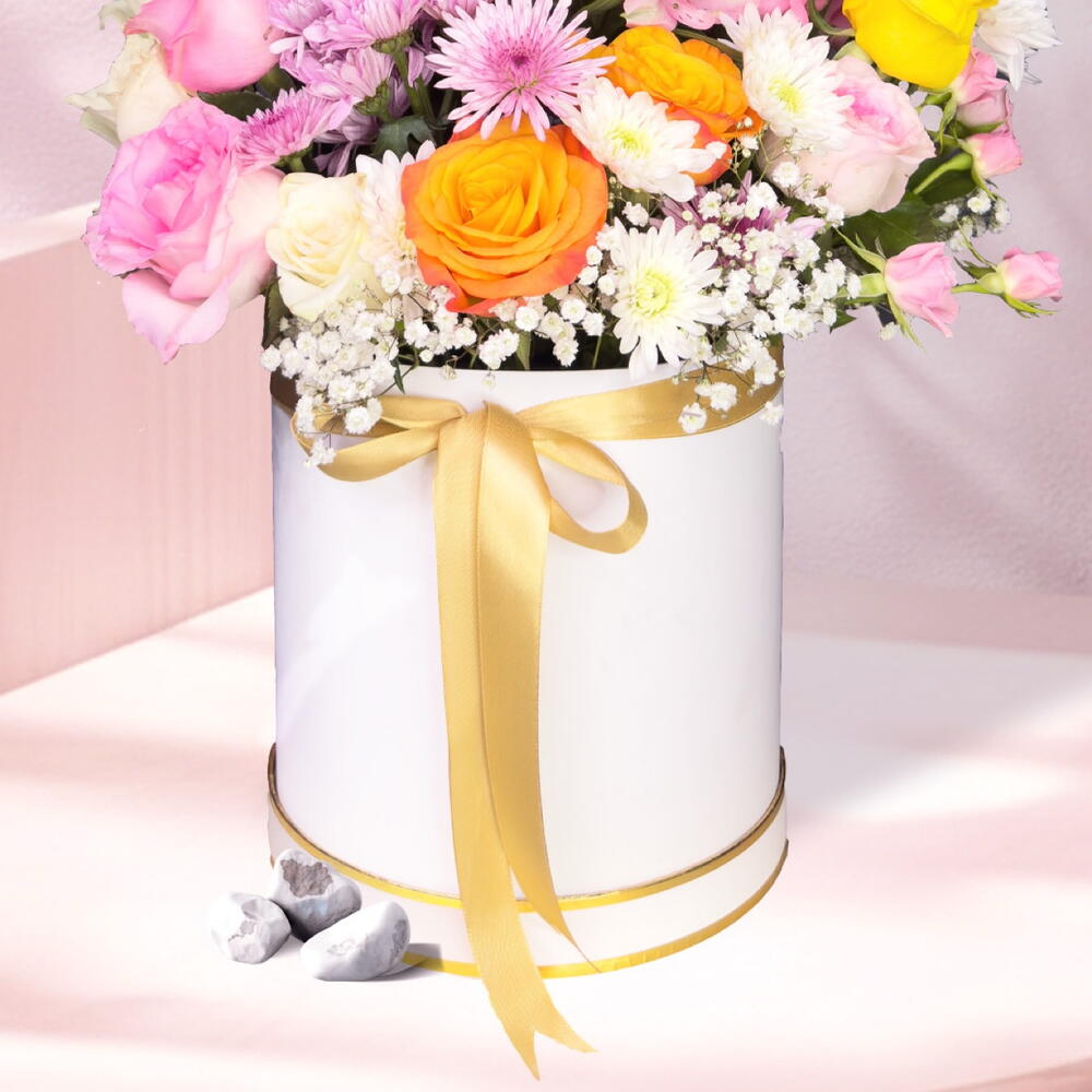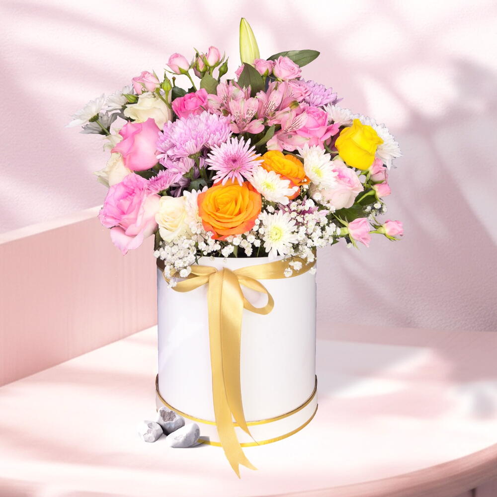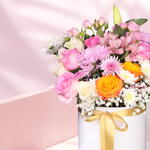 Box - 1 шт. Lily - 1 шт. Pink rose - 5 шт. Gypsophila - 3 шт. white chrysanthemum - 5 шт. pink chrysanthemum - 5 шт. pink baby rose - 4 шт. white rose - 3 шт. yellow/orange roses - 3 шт.