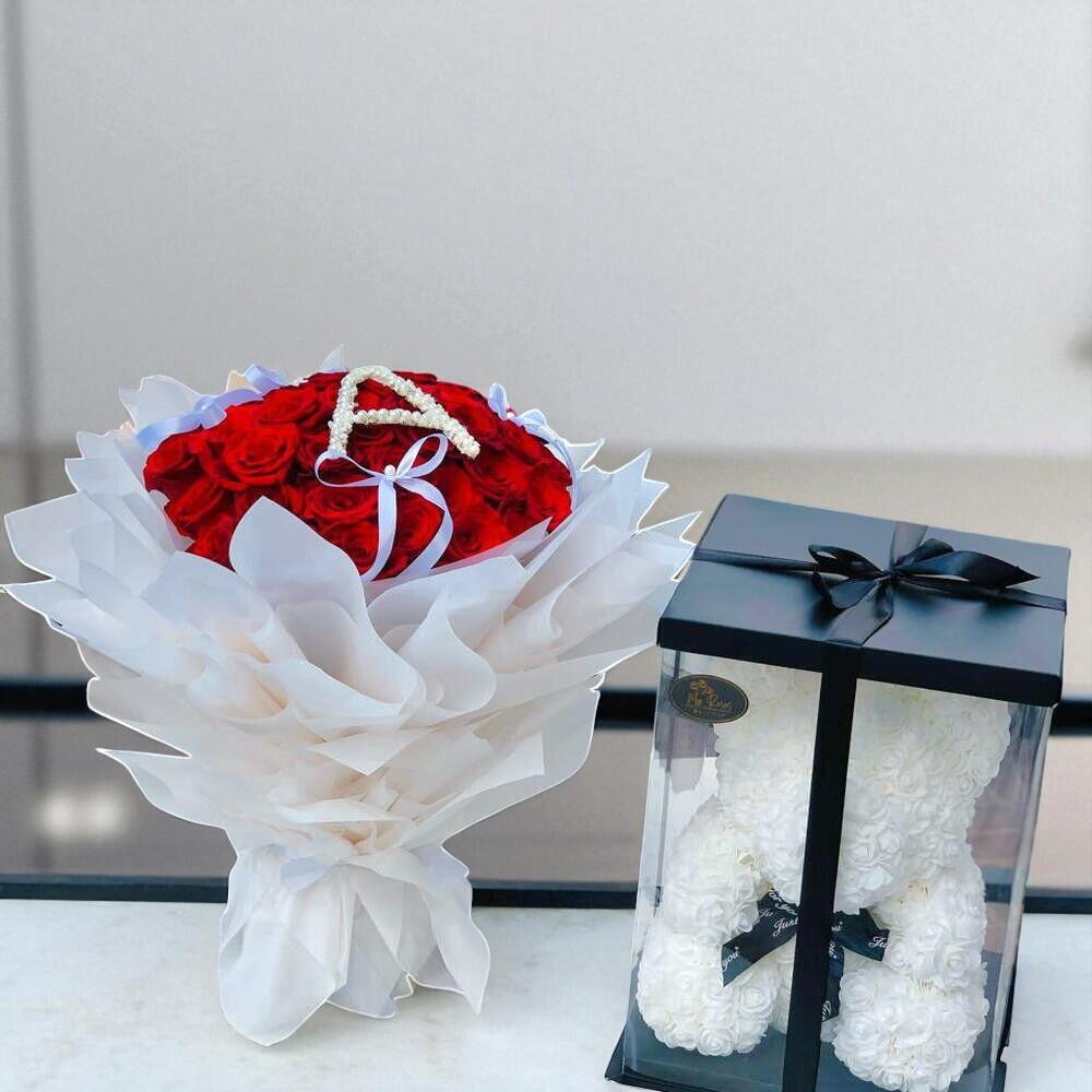 красная роза 50 и белый медвежонок из пенопласта 40см буква из цветов (индивидуально любую букву) и бесплатная поздравительная открытка